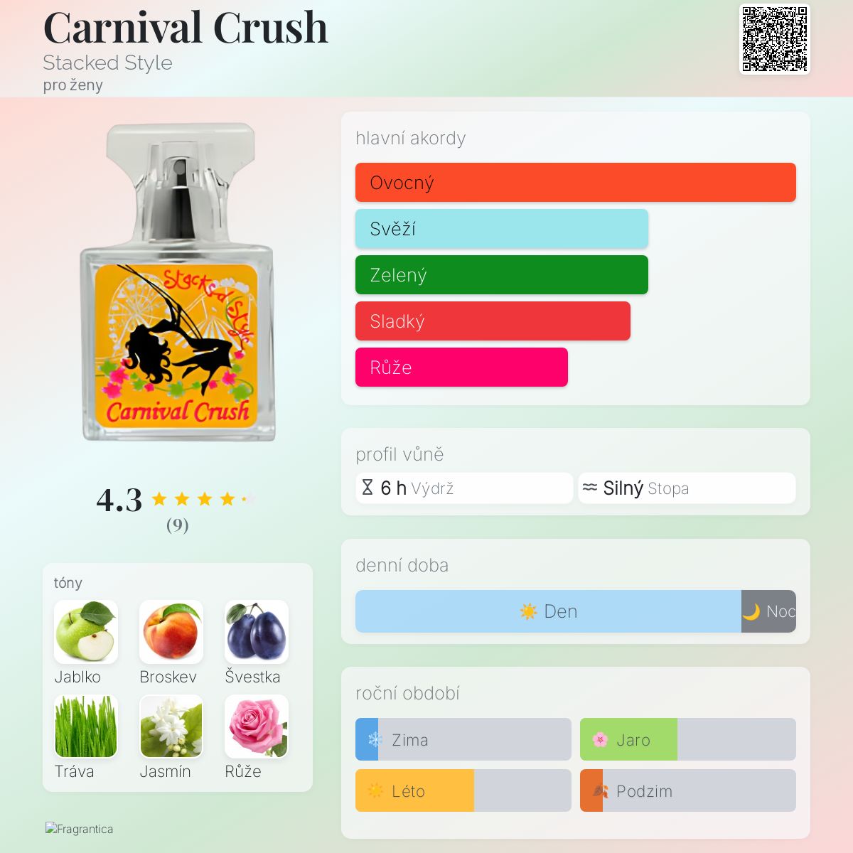 Carnival Crush podle Stacked Style je Floral Fruity vůně pro ženy. Carnival Crush byla spuštěna během 2000. "Nosem" za touto vůní je Linda Sivrican. Vrchní tóny jsou Granny Smith jablko, Broskev a Švestka; střední tóny jsouTráva, Jasmín a Růže ; základní tóny jsou Pižmo a Cukr.