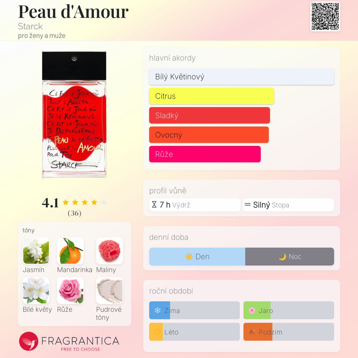 Peau d'Amour podle Starck je Orientální Floral vůně pro ženy a muže. Peau d'Amour byl/a uveden/a v roce 2020. "Nosem" za touto vůní je Dominique Ropion. Vrchní tóny jsou Mandarinka, Maliny a Zázvor; střední tóny jsouEgyptský jasmín, Bílé květy, Růže, Pomerančový květ a Konvalinka ; základní tóny jsou Pudrové tóny, Fazole tonka, Minerální tóny, Pačuli a Jantar (ambra).
