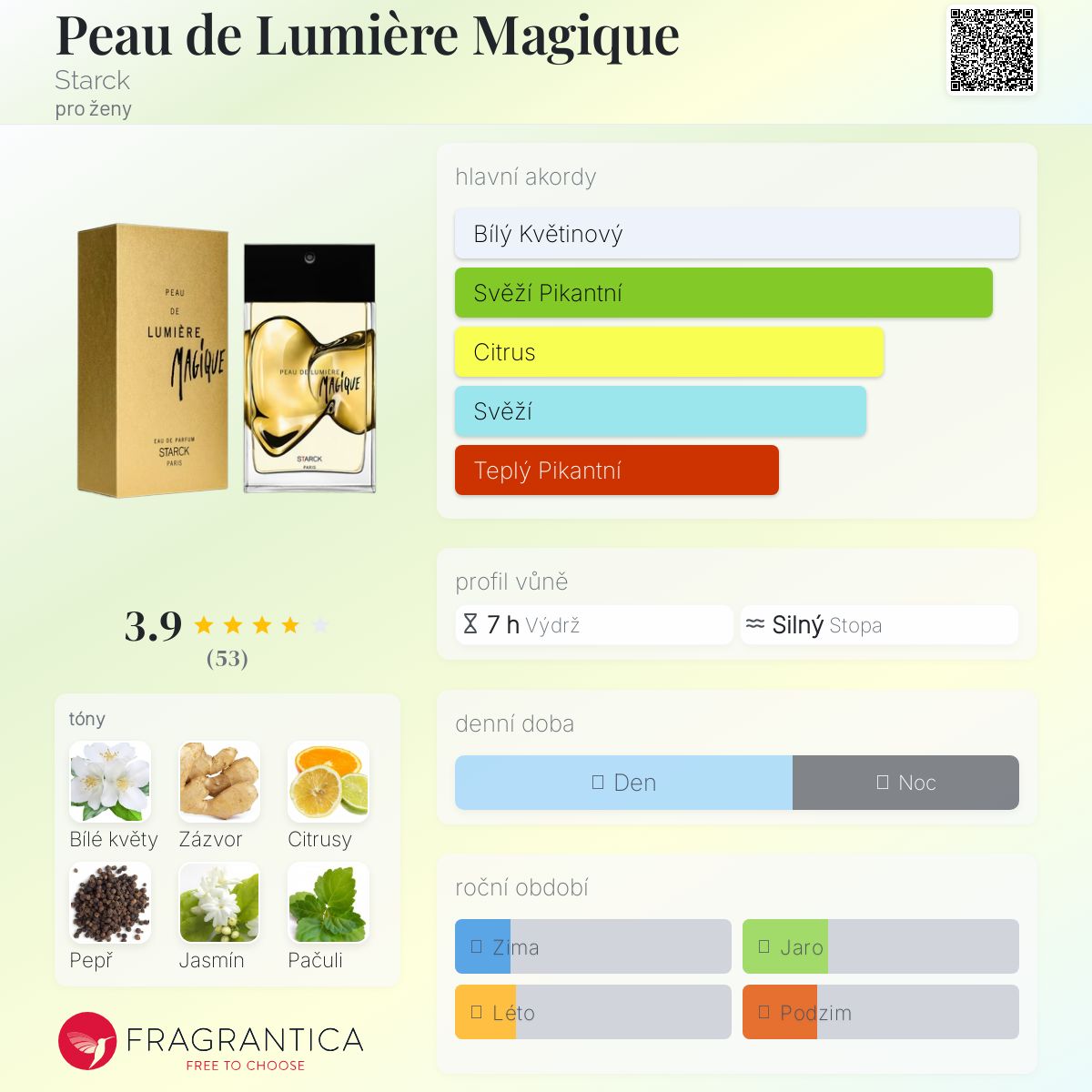 Peau de Lumière Magique podle Starck je Floral vůně pro ženy. Peau de Lumière Magique byl/a uveden/a v roce 2018. "Nosem" za touto vůní je Daphné Bugey.