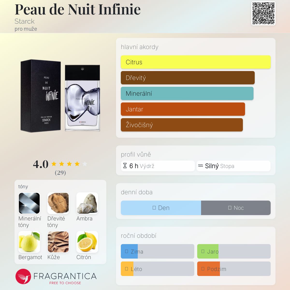 Peau de Nuit Infinie podle Starck je Woody vůně pro muže. Peau de Nuit Infinie byl/a uveden/a v roce 2018. "Nosem" za touto vůní je Delphine Lebeau.