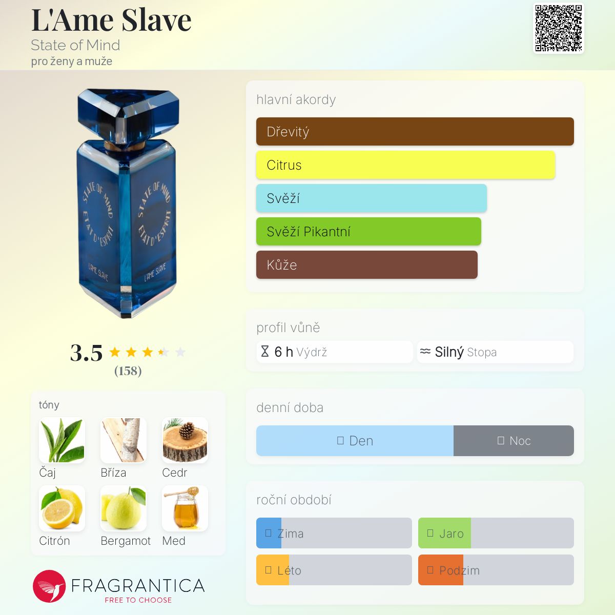 L'Ame Slave podle State of Mind je Aromatic Spicy vůně pro ženy a muže. L'Ame Slave byl/a uveden/a v roce 2017. "Nosem" za touto vůní je Karine Dubreuil-Sereni. Vrchní tóny jsou Citrón, Bergamot a Šeřík; střední tóny jsouMed, Vanilka a Zázvor ; základní tóny jsou Čaj, Bříza, Cedr a Santalové dřevo.