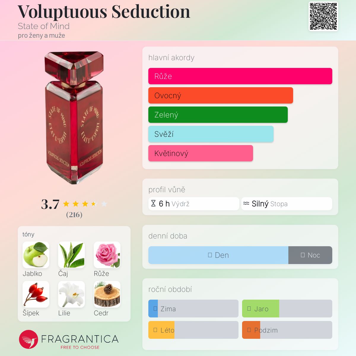 Voluptuous Seduction podle State of Mind je Floral vůně pro ženy a muže. Voluptuous Seduction byl/a uveden/a v roce 2017. "Nosem" za touto vůní je Karine Dubreuil-Sereni. Vrchní tóny jsou Jablko, Čaj a Lilie; střední tóny jsouRůže, Šípek a Zimnokvět ; základní tóny jsou Cedr a Santalové dřevo.