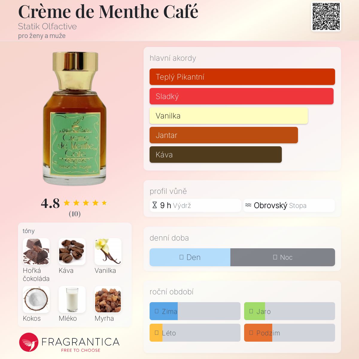 Crème de Menthe Café podle Statik Olfactive je vůně pro ženy a muže. Toto je nová vůně. Crème de Menthe Café byl/a uveden/a v roce 2025. "Nosem" za touto vůní je Hez Binkowitz. Vrchní tóny jsou Hořká čokoláda, Kokosové mléko, Šlehačka, Pikantní máta a Máta; střední tóny jsouHořká čokoláda, Káva, Bourbonská vanilka, Kokos, Mléko, Myrha, Rum, Sirup a Sladký pomeranč ; základní tóny jsou Káva, Benzoin, Koňak, Kakaové máslo, Hnědý cukr, Kadidlo, Santalové dřevo, Labdanum, Ambra a Bílé pižmo.