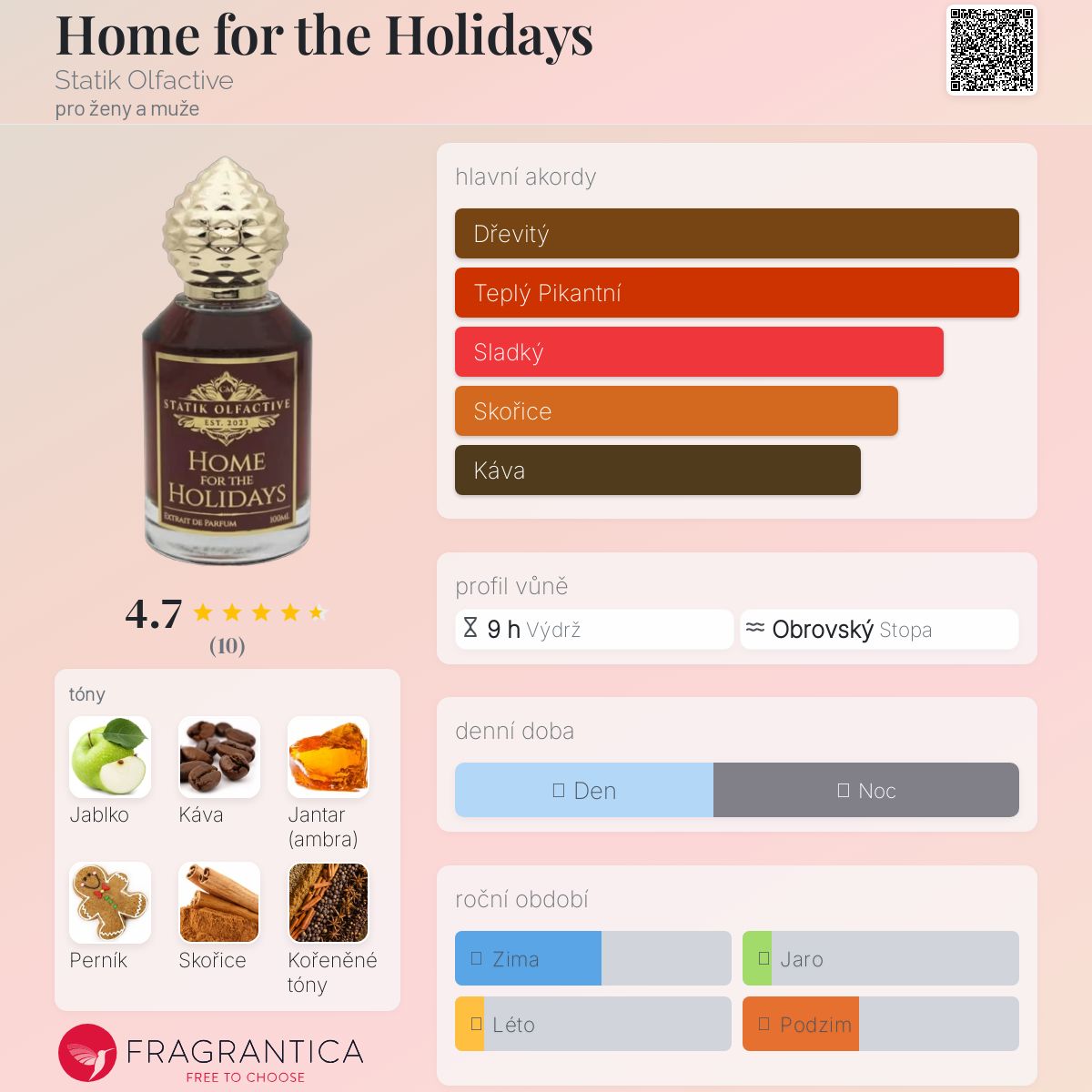 Home for the Holidays podle Statik Olfactive je vůně pro ženy a muže. Home for the Holidays byl/a uveden/a v roce 2025. "Nosem" za touto vůní je Hez Binkowitz. Vrchní tóny jsou Jablko, Perník, Skořice a Kořeněné tóny; střední tóny jsouKáva, Irský krém Baileys, Popcorn a Mléko ; základní tóny jsou Káva, Jantar (ambra), Javor, Hnědý cukr, Jedle balzámová, Borovice a Australské santalové dřevo.