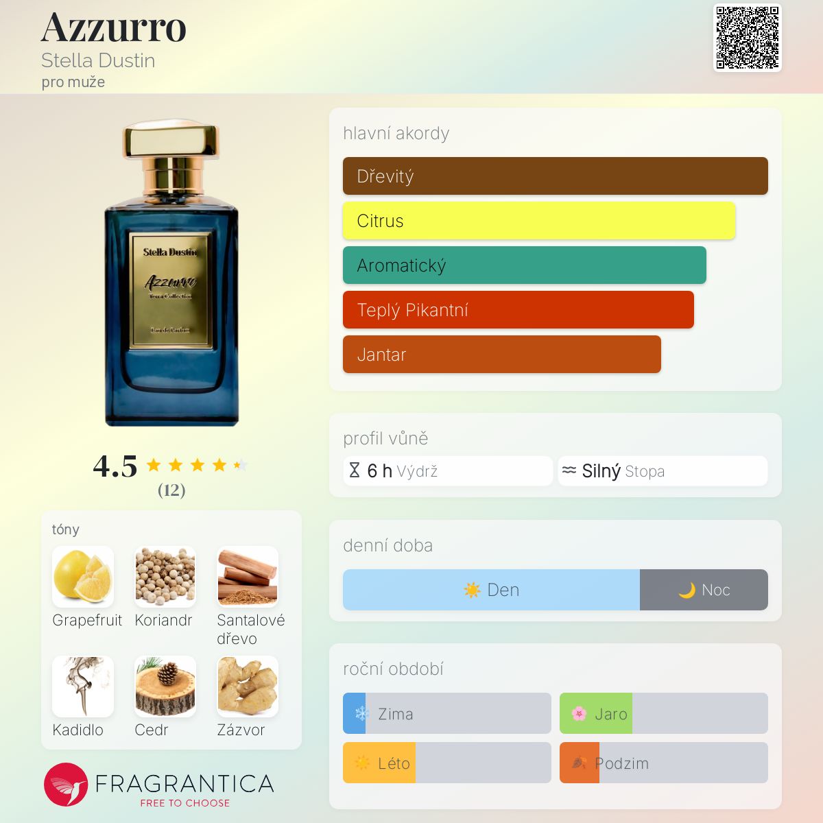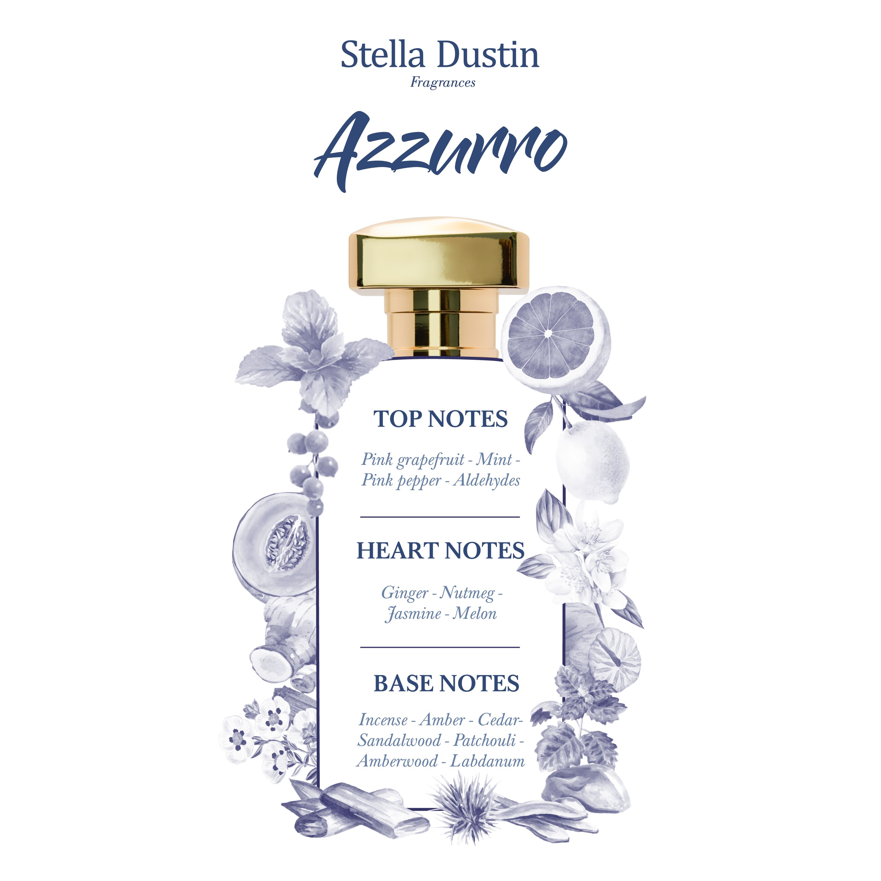 Azzurro podle Stella Dustin je Woody Aromatic vůně pro muže. Azzurro byl/a uveden/a v roce 2023. Vrchní tóny jsou Grapefruit, Koriandr, Limetka, Růžový pepř, Bergamot, Máta, Aldehydy a Zelené listí; střední tóny jsouZázvor, Jasmín, Meloun a Muškátový oříšek ; základní tóny jsou Kadidlo, Cedr, Santalové dřevo, Pačuli, Jantar (ambra), Pryskyřice, Jantarové dřevo a Labdanum.