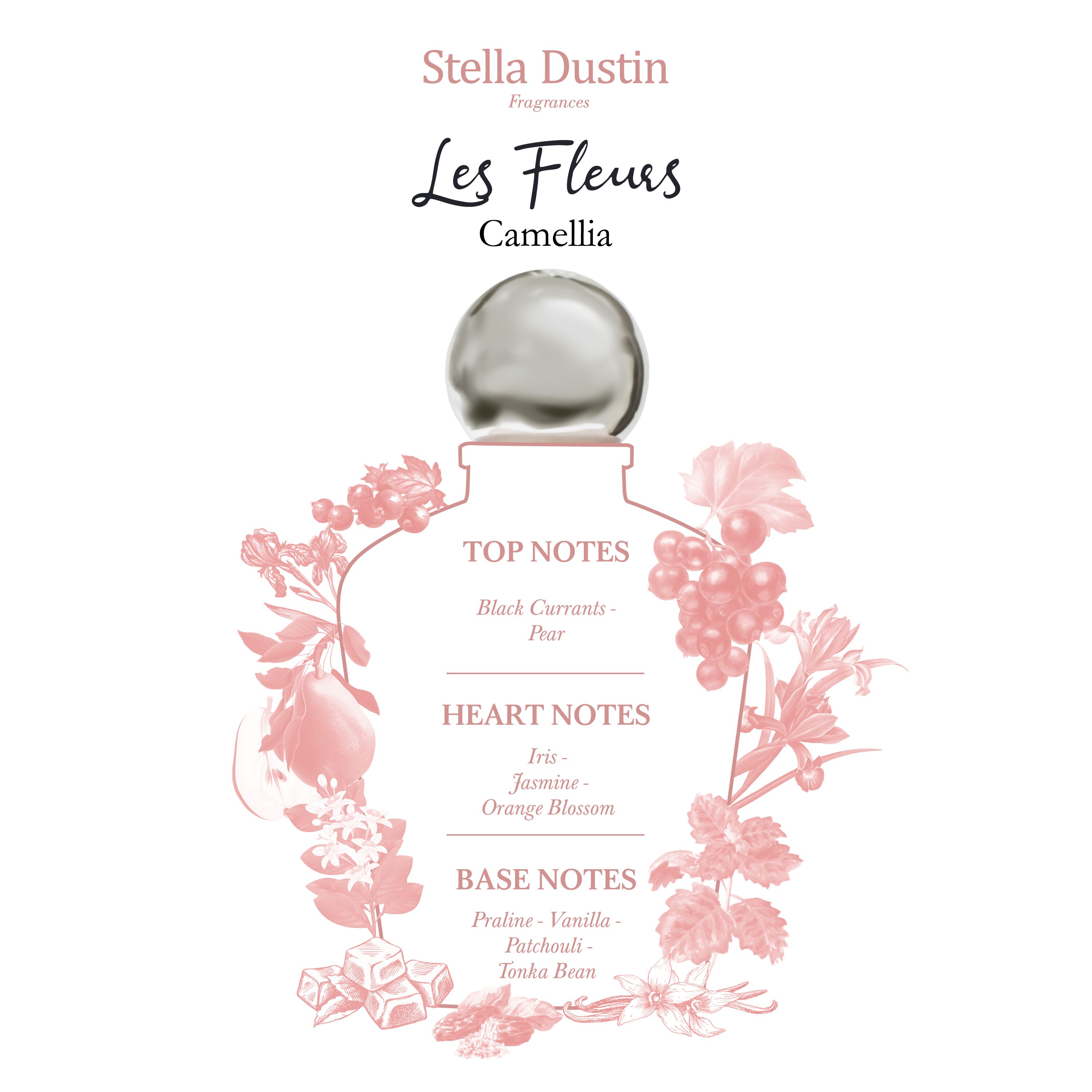 Camellia podle Stella Dustin je Floral Fruity Gourmand vůně pro ženy. Camellia byl/a uveden/a v roce 2023. Vrchní tóny jsou Hruška a Černý rybíz; střední tóny jsouPomerančový květ, Kosatec a Jasmín Sambac ; základní tóny jsou Pralinka, Madagaskarská vanilka, Fazole tonka a Pačuli.
