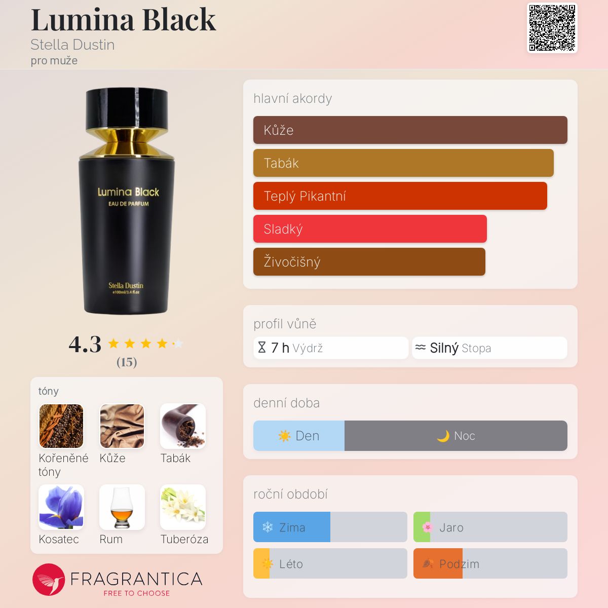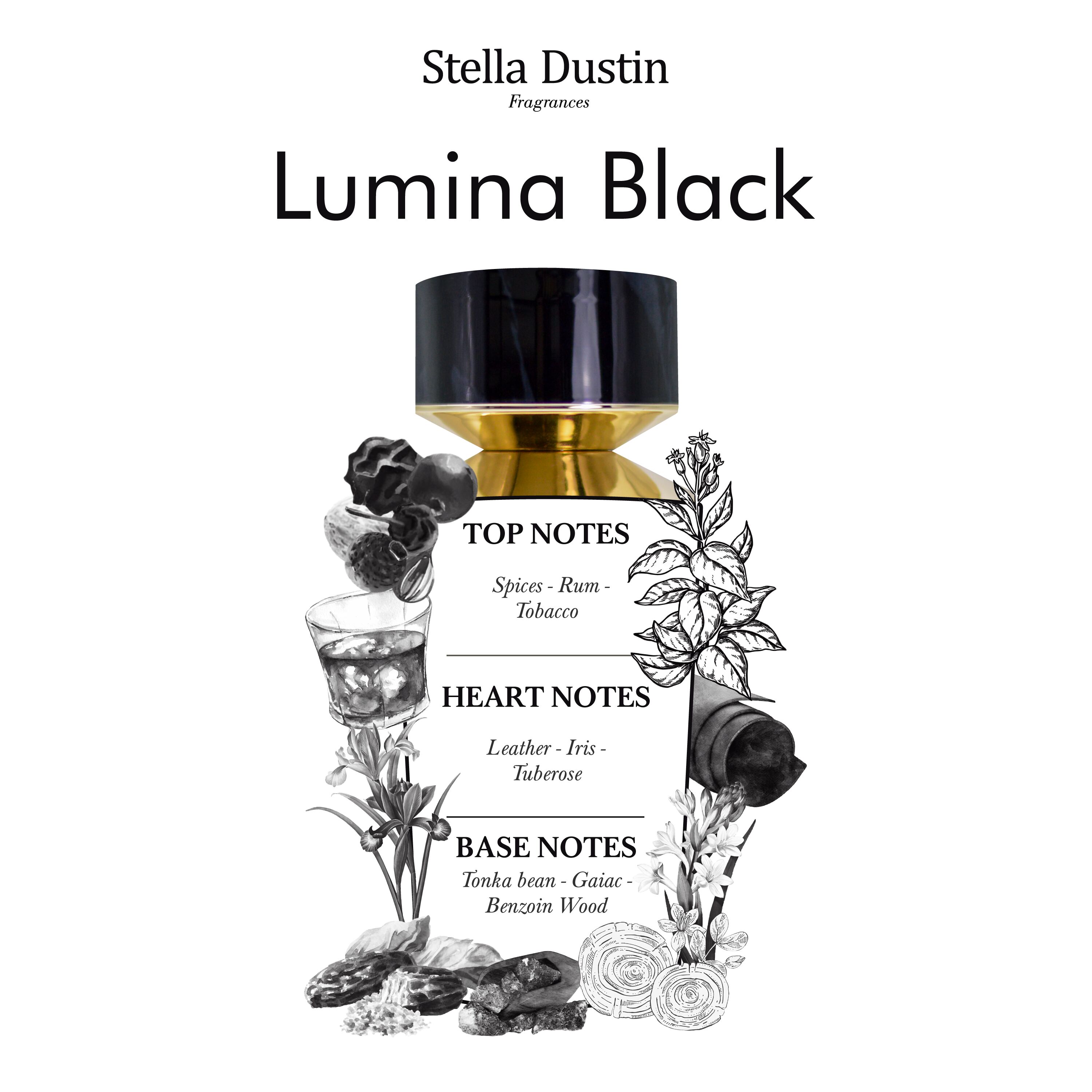 Lumina Black podle Stella Dustin je Orientální Floral vůně pro muže. Lumina Black byl/a uveden/a v roce 2023. Vrchní tóny jsou Koření, Tabákový list a Rum; střední tóny jsouKůže, Kosatec a Tuberóza ; základní tóny jsou Fazole tonka, Benzoin a Guajakové dřevo.