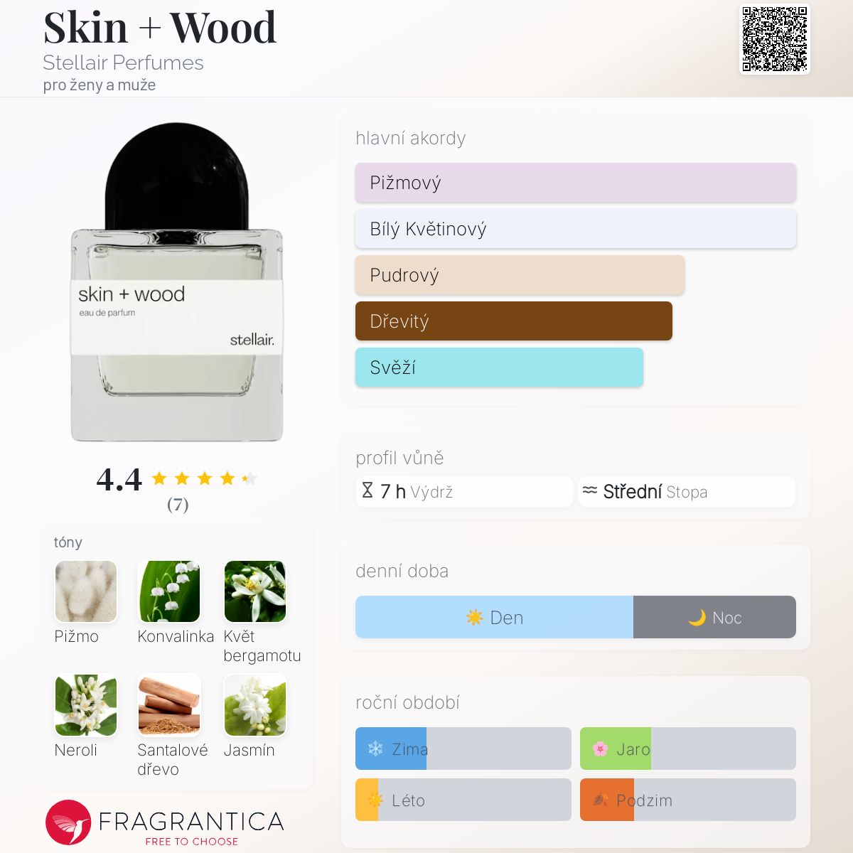 Skin + Wood podle Stellair Perfumes je vůně pro ženy a muže. Skin + Wood byl/a uveden/a v roce 2023. Vrchní tóny jsou Květ bergamotu a Neroli; střední tóny jsouKonvalinka, Santalové dřevo a Jasmín ; základní tóny jsou Bílé pižmo, Cedr a Ambrette (přírodní pižmo).