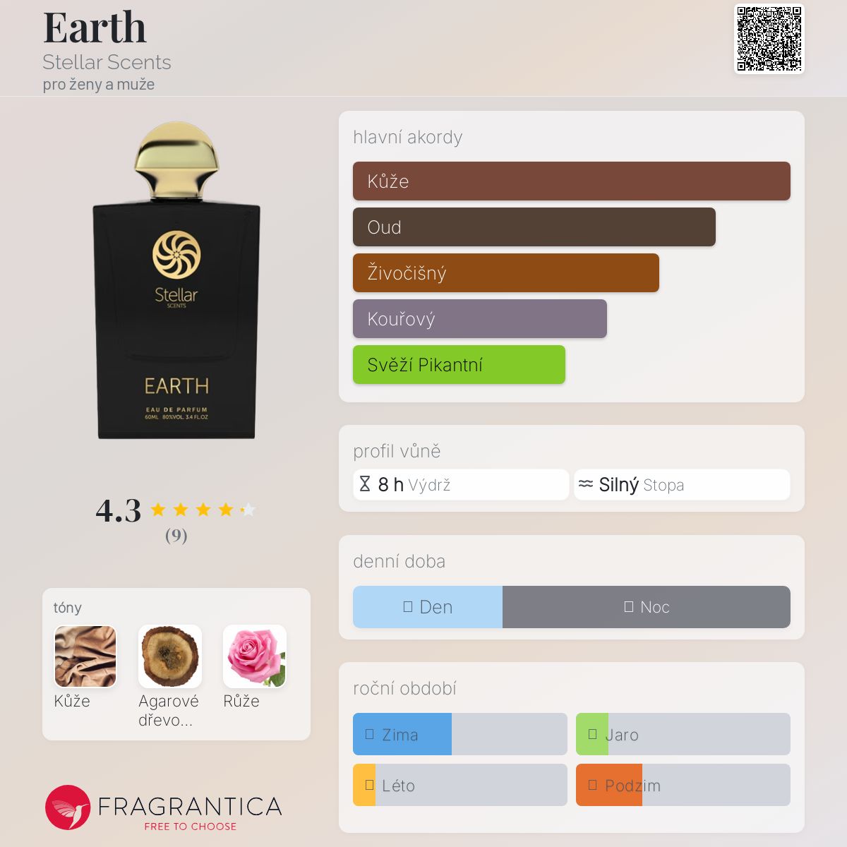 Earth podle Stellar Scents je Leather vůně pro ženy a muže. Earth byl/a uveden/a v roce 2021. Vrchní tón je Růže ; základní tóny jsou Kůže a Agarové dřevo (oud).
