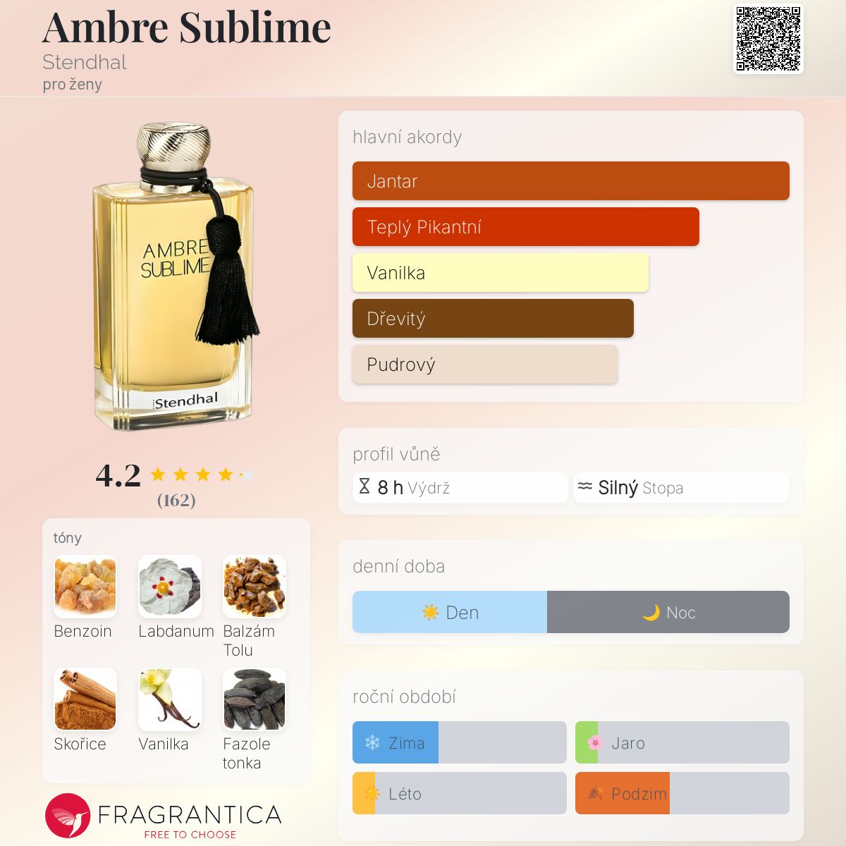 Ambre Sublime podle Stendhal je Orientální Spicy vůně pro ženy. Ambre Sublime byl/a uveden/a v roce 2010. Vrchní tóny jsou Ylang-Ylang, Jablko, Neroli a Bergamot; střední tóny jsouLabdanum, Skořice, Kašmírové dřevo, Kardamom a Růže ; základní tóny jsou Benzoin, Labdanum, Balzám Tolu, Vanilka, Fazole tonka, Santalové dřevo, Pižmo a Pačuli.