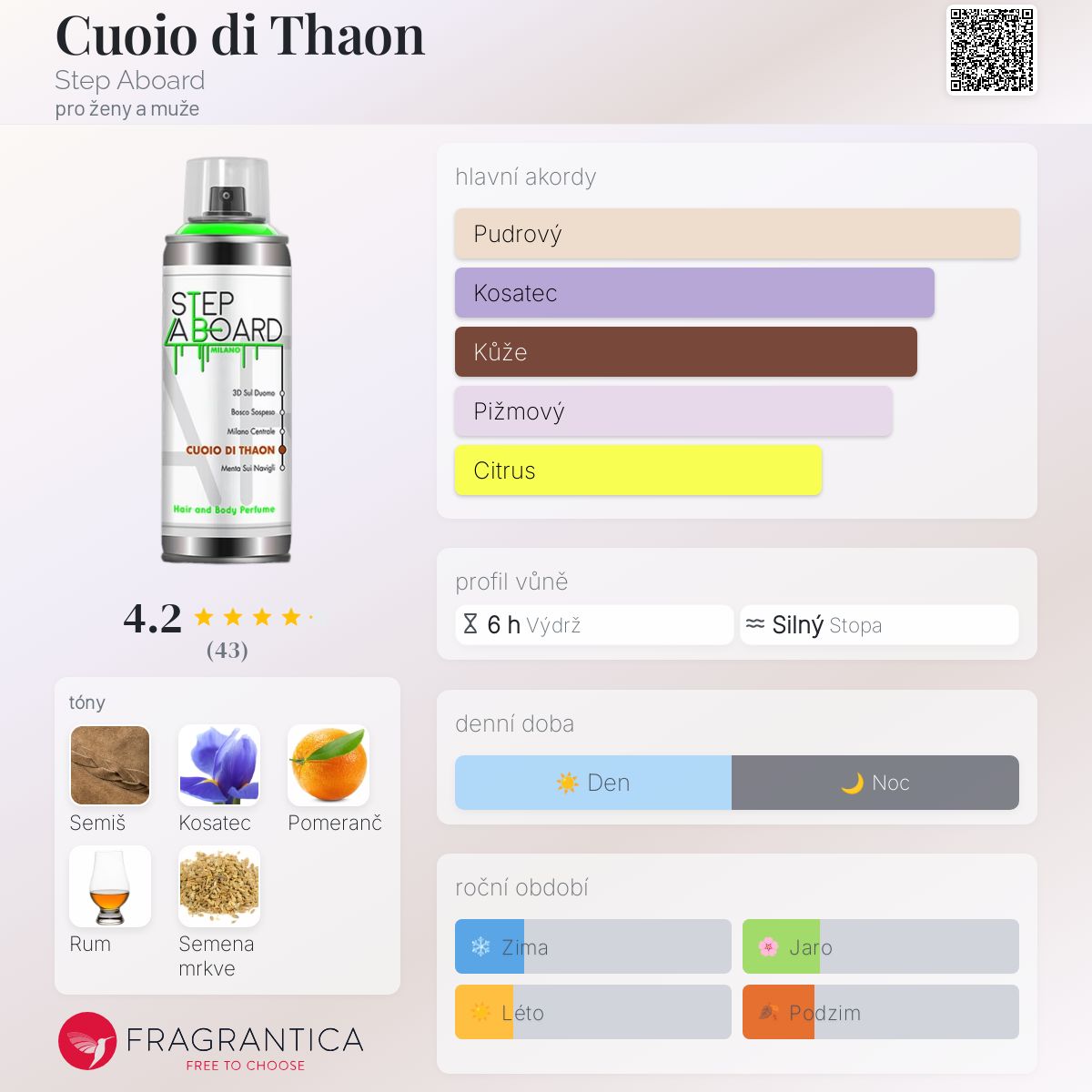 Cuoio di Thaon podle Step Aboard je Leather vůně pro ženy a muže. Cuoio di Thaon byl/a uveden/a v roce 2018. "Nosem" za touto vůní je Bertrand Duchaufour. Vrchní tón je Sladký pomeranč ; střední tóny jsouRum a Semena mrkve ; základní tóny jsou Semiš a Kosatec.