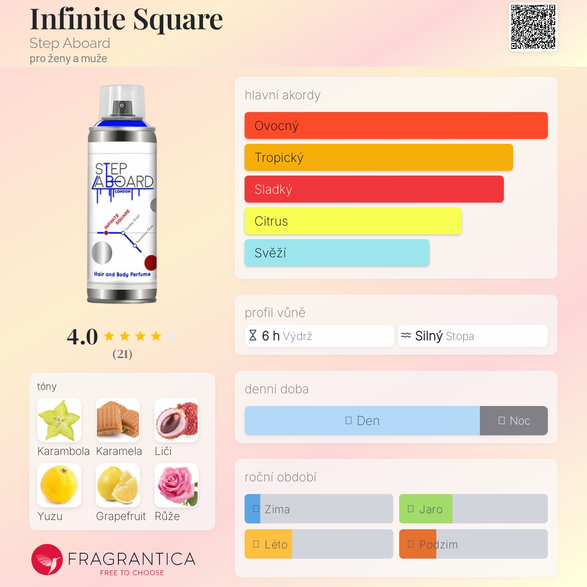Infinite Square podle Step Aboard je Floral Fruity Gourmand vůně pro ženy a muže. Infinite Square byl/a uveden/a v roce 2021. "Nosem" za touto vůní je Bertrand Duchaufour. Vrchní tóny jsou Yuzu a Grapefruit; střední tóny jsouKarambola, Liči a Růže ; základní tóny jsou Karamela, Naplavené dříví a Růžový pepř.