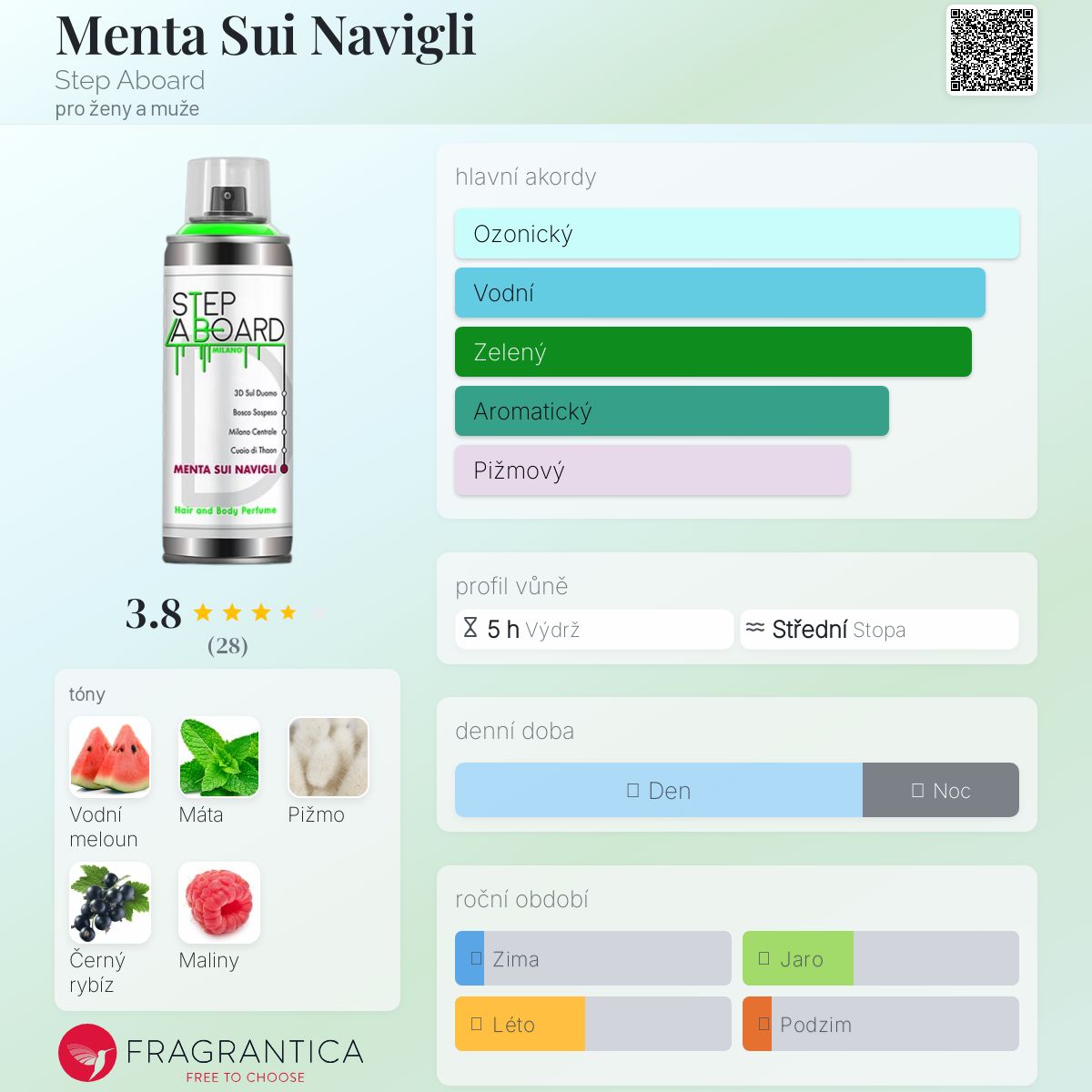 Menta Sui Navigli podle Step Aboard je Aromatic Fruity vůně pro ženy a muže. Menta Sui Navigli byl/a uveden/a v roce 2018. "Nosem" za touto vůní je Morgane Collinot. Vrchní tón je Máta ; střední tóny jsouVodní meloun, Černý rybíz a Maliny ; základní tón je Pižmo.