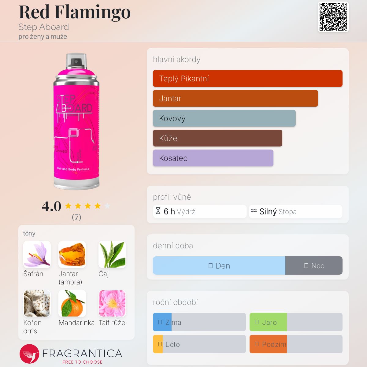 Red Flamingo podle Step Aboard je Orientální Floral vůně pro ženy a muže. Red Flamingo byl/a uveden/a v roce 2023. "Nosem" za touto vůní je Arthur Marrast. Vrchní tóny jsou Černý čaj a Mandarinka; střední tón jeTaif růže ; základní tóny jsou Šafrán, Jantar (ambra), Kořen orris a Cedr.