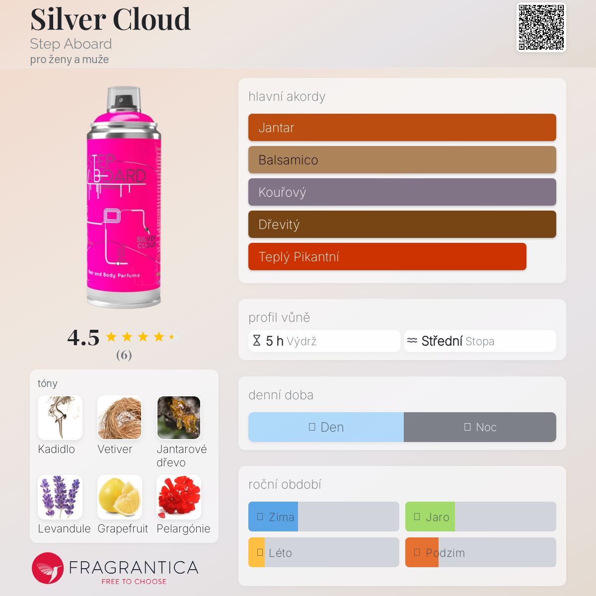 Silver Cloud podle Step Aboard je Aromatic vůně pro ženy a muže. Silver Cloud byl/a uveden/a v roce 2023. "Nosem" za touto vůní je Bertrand Duchaufour. Vrchní tóny jsou Levandule a Grapefruit; střední tón jePelargónie ; základní tóny jsou Kadidlo, Vetiver, Jantarové dřevo, Jalovcové bobulky a Fazole tonka.