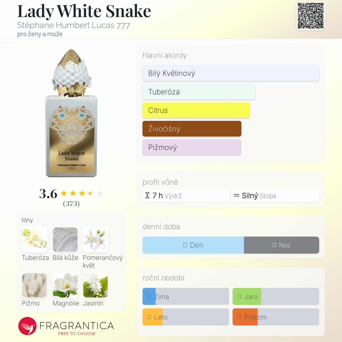 Lady White Snake podle Stéphane Humbert Lucas 777 je Orientální Floral vůně pro ženy a muže. Lady White Snake byl/a uveden/a v roce 2022. "Nosem" za touto vůní je Stéphane Humbert Lucas. Vrchní tóny jsou Pomerančový květ, Zimolez a Mandarinka; střední tóny jsouTuberóza, Magnólie a Jasmín ; základní tóny jsou Bílá kůže, Bílé pižmo a Jantar (ambra).