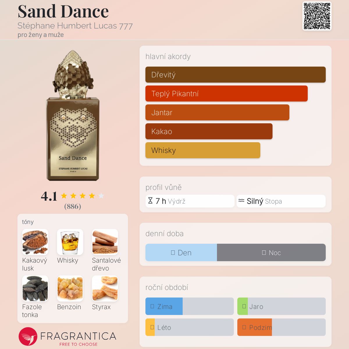 Sand Dance podle Stéphane Humbert Lucas 777 je Orientální Vanilla vůně pro ženy a muže. Toto je nová vůně. Sand Dance byl/a uveden/a v roce 2022. "Nosem" za touto vůní je Stéphane Humbert Lucas. Vrchní tóny jsou Whisky, Koriandr, Mandarinka, Anýz a Sezam; střední tóny jsouKakao, Santalové dřevo a Kašmír ; základní tóny jsou Fazole tonka, Benzoin, Styrax, Extrakt z bílého cedru, Pačuli, Vanilka a Kašmírové dřevo.