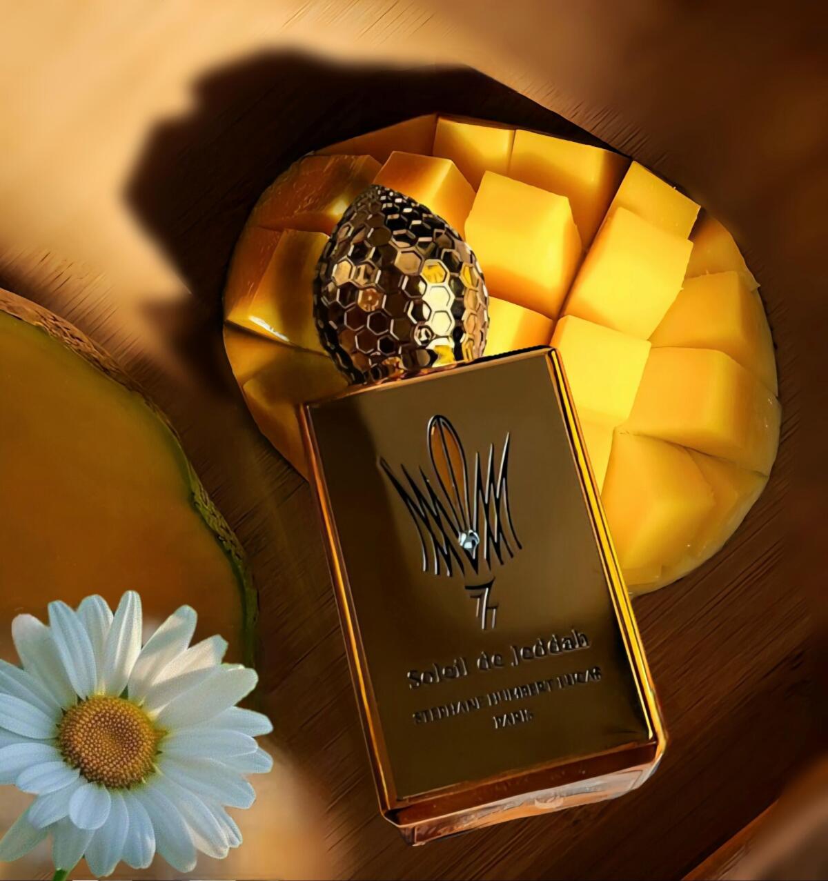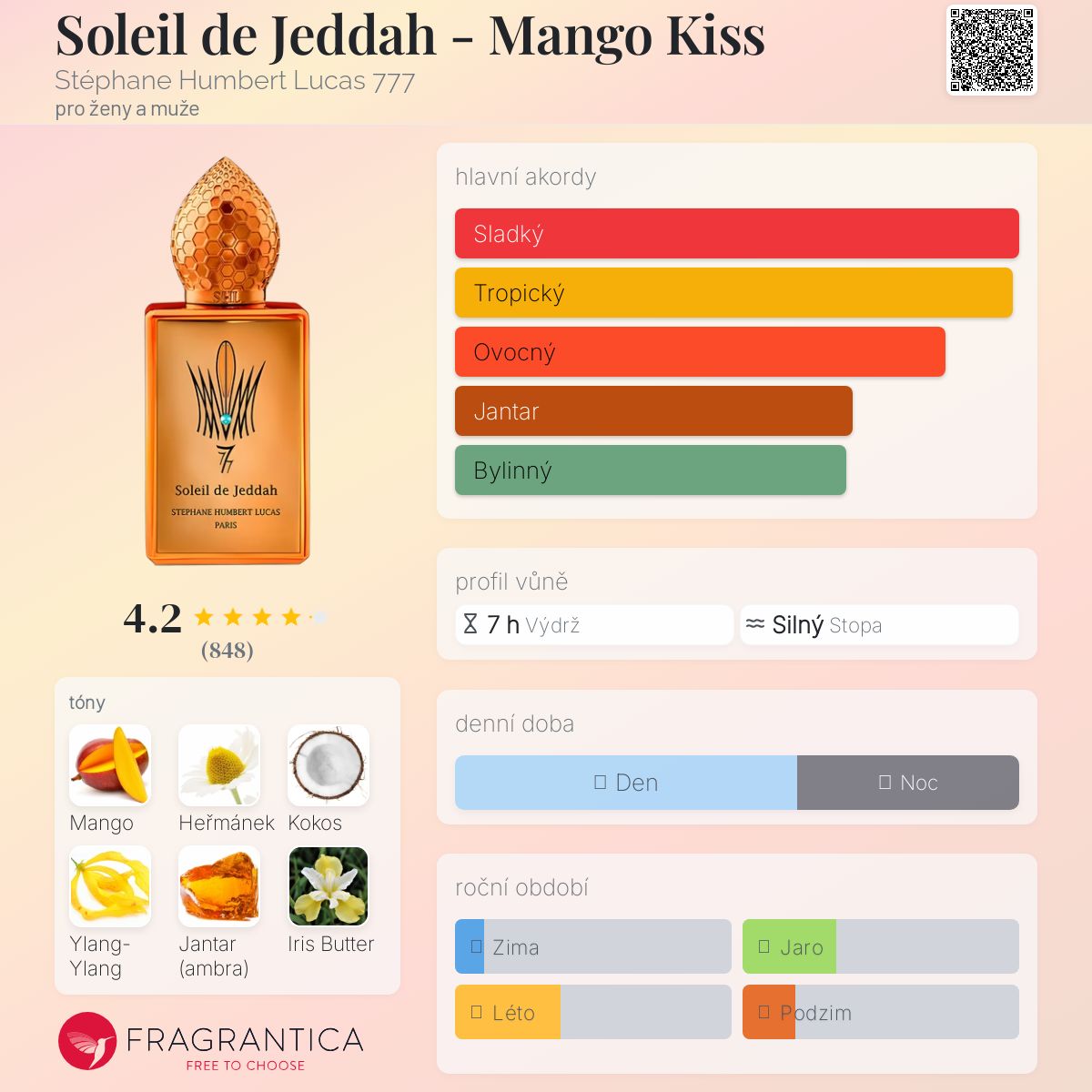 Soleil de Jeddah - Mango Kiss podle Stéphane Humbert Lucas 777 je vůně pro ženy a muže. Toto je nová vůně. Soleil de Jeddah - Mango Kiss byl/a uveden/a v roce 2022. Vrchní tóny jsou Mango, Heřmánek a Pomerančový květ; střední tóny jsouKokos, Ylang-Ylang, Jantar (ambra) a Fík ; základní tóny jsou Kosatcové máslo, Vanilka, Siamský (thajský) benzoin a Santalové dřevo.