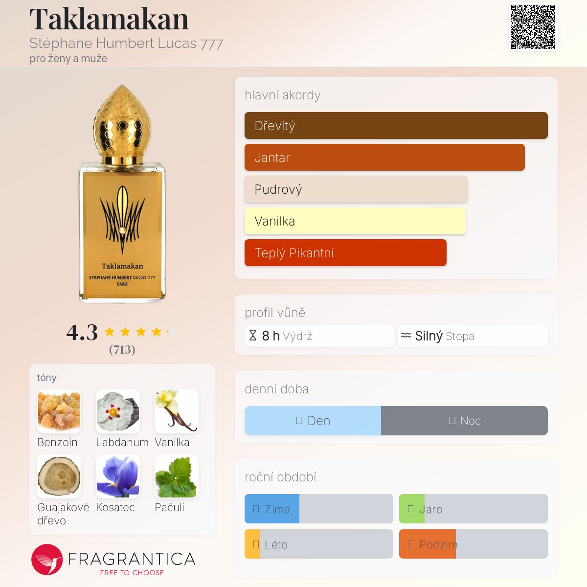 Taklamakan podle Stéphane Humbert Lucas 777 je vůně pro ženy a muže. Taklamakan byl/a uveden/a v roce 2016. "Nosem" za touto vůní je Stéphane Humbert Lucas.