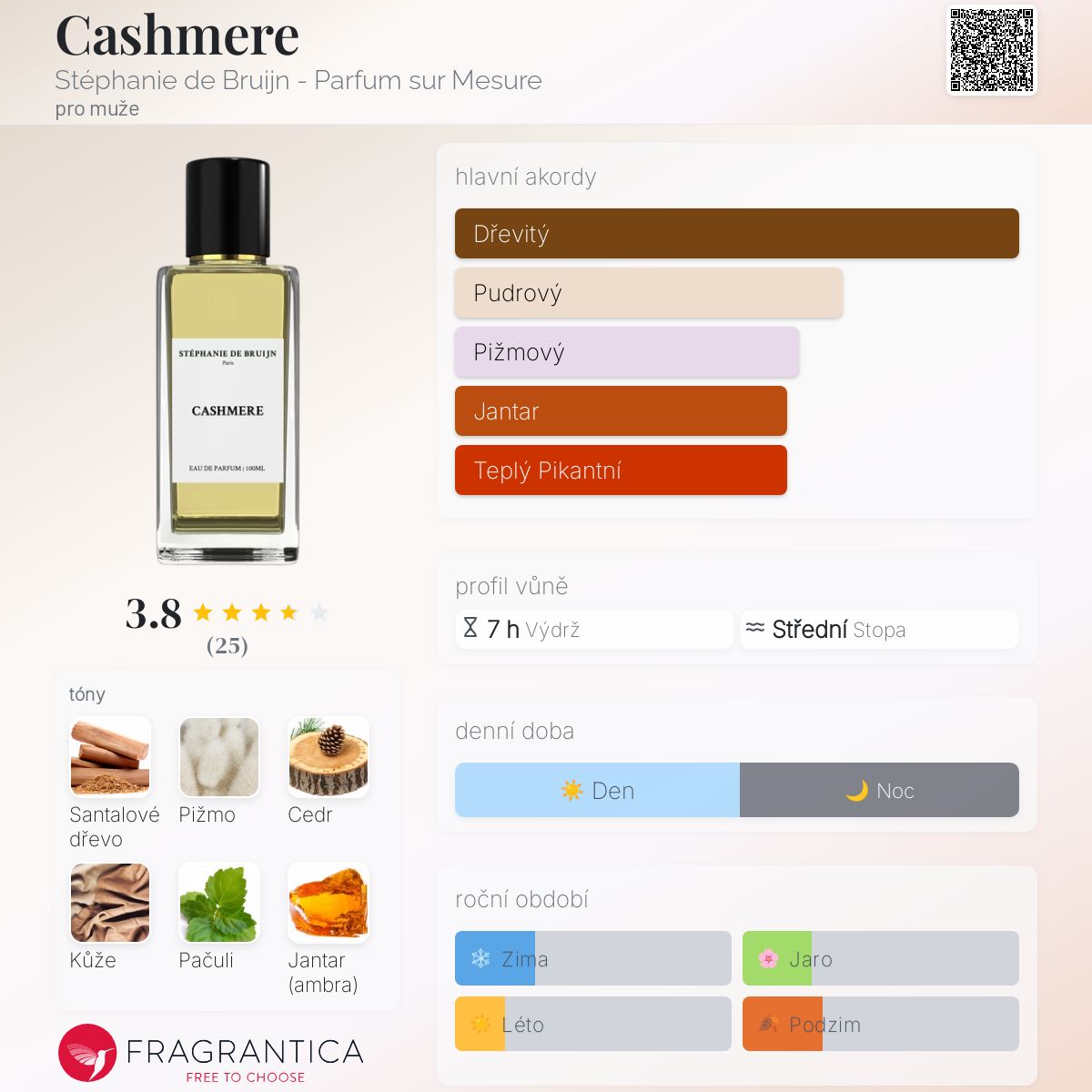 Cashmere podle Stéphanie de Bruijn - Parfum sur Mesure je Woody vůně pro muže. Cashmere byl/a uveden/a v roce 2020. "Nosem" za touto vůní je Stéphanie de Bruijn.