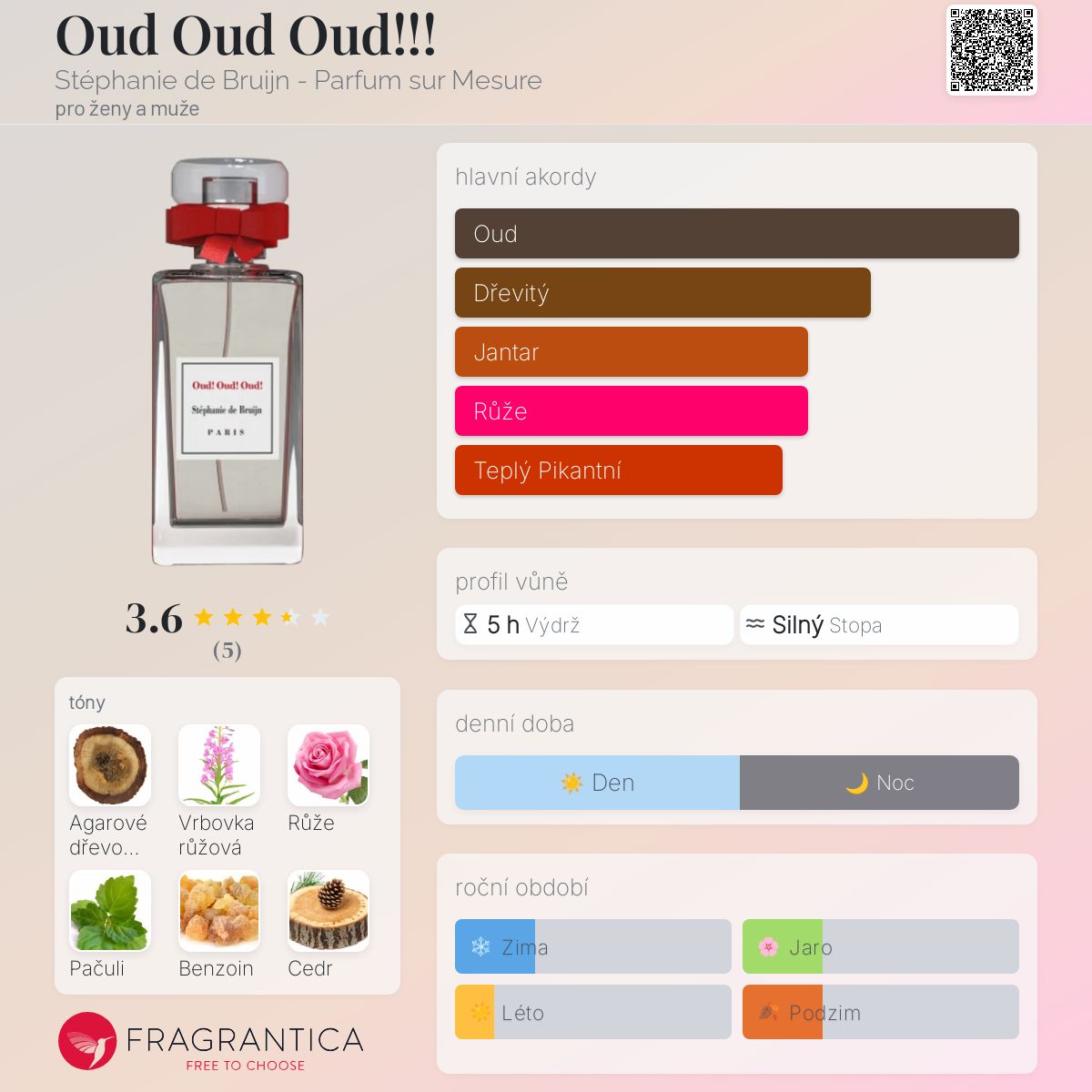 Oud Oud Oud!!! podle Stéphanie de Bruijn - Parfum sur Mesure je Orientální vůně pro ženy a muže. Oud Oud Oud!!! byl/a uveden/a v roce 2013. "Nosem" za touto vůní je Stéphanie de Bruijn. Vrchní tóny jsou Vrbka úzkolistá a Turecký růžový olej; střední tóny jsouAgarové dřevo (oud), List indonéského pačuli, Benzoin a Cedr ; základní tóny jsou Kůže, Santalové dřevo, Pižmo, Madagaskarská vanilka, Jantar (ambra) a Dubový mech.
