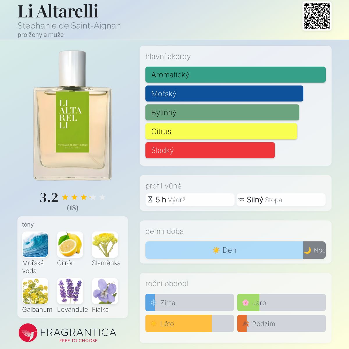 Li Altarelli podle Stephanie de Saint-Aignan je Aromatic vůně pro ženy a muže. Li Altarelli byl/a uveden/a v roce 2008. "Nosem" za touto vůní je Stephanie de Saint-Aignan.