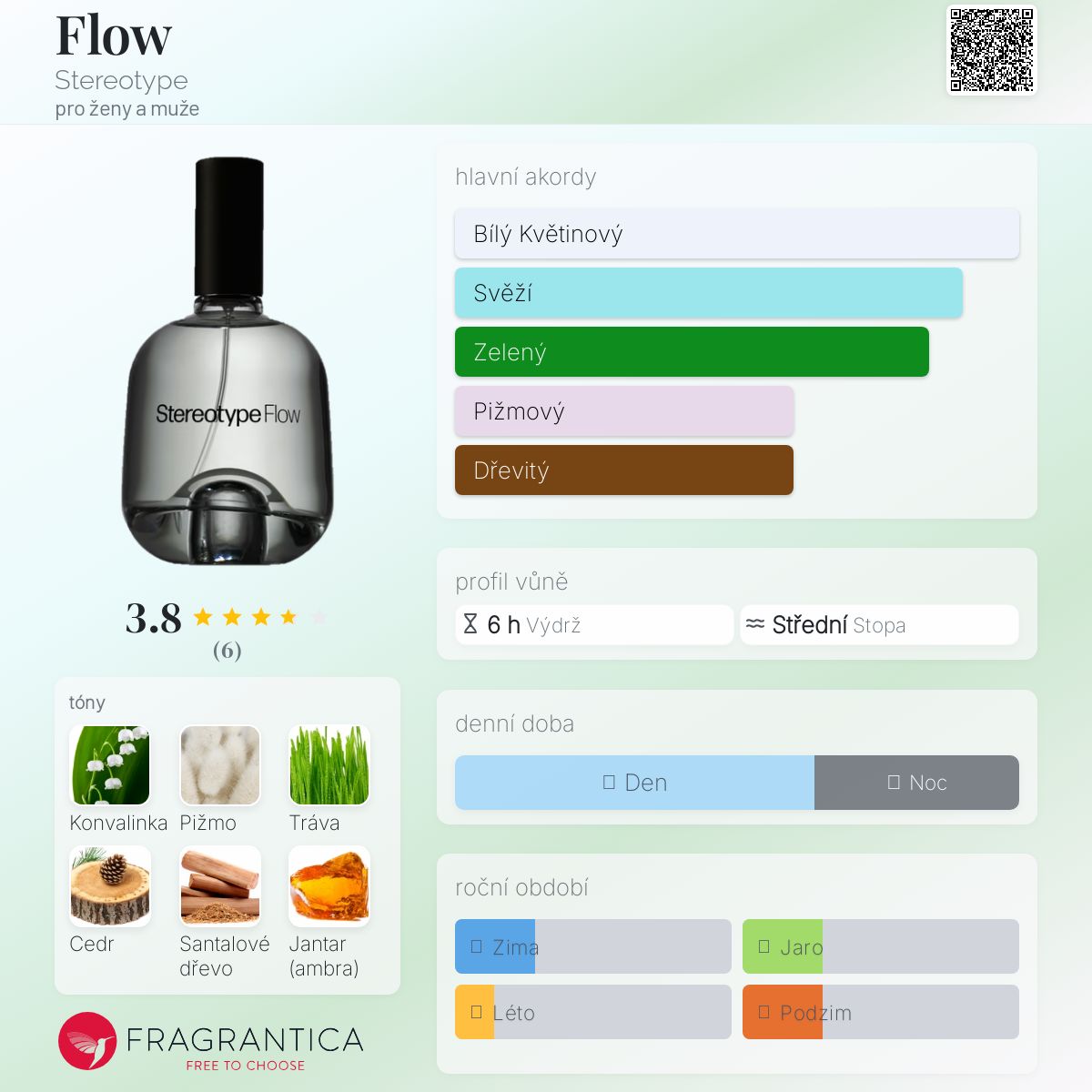 Flow podle Stereotype je Woody Floral Musk vůně pro ženy a muže. Toto je nová vůně. Flow byl/a uveden/a v roce 2025. "Nosem" za touto vůní je Lucas Sieuzac. Vrchní tóny jsou Konvalinka, Pižmo a Tráva; střední tóny jsouKonvalinka, Pižmo a Santalové dřevo ; základní tóny jsou Cedr, Pižmo a Jantar (ambra).