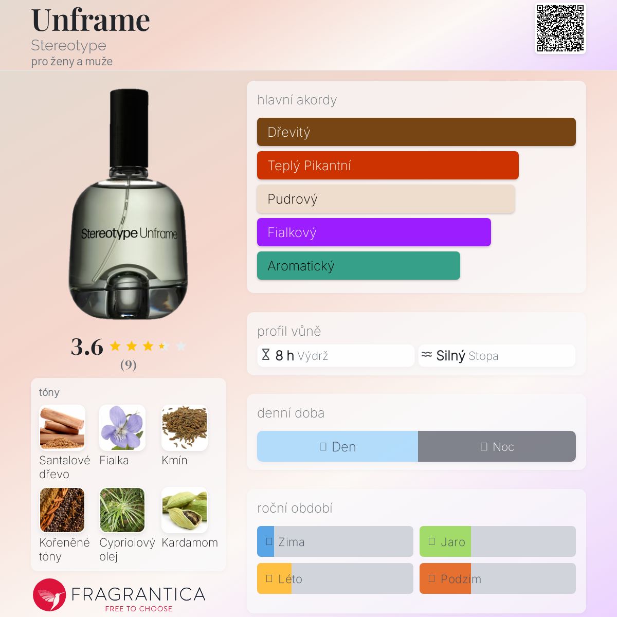 Unframe podle Stereotype je Woody Spicy vůně pro ženy a muže. Toto je nová vůně. Unframe byl/a uveden/a v roce 2025. "Nosem" za touto vůní je Angéline Leporini. Vrchní tóny jsou Kmín, Koření, Kardamom a Bazalka; střední tóny jsouSantalové dřevo, Fialka a Cypriolový olej ; základní tóny jsou Santalové dřevo, Mléko, Cedr a Pižmo.