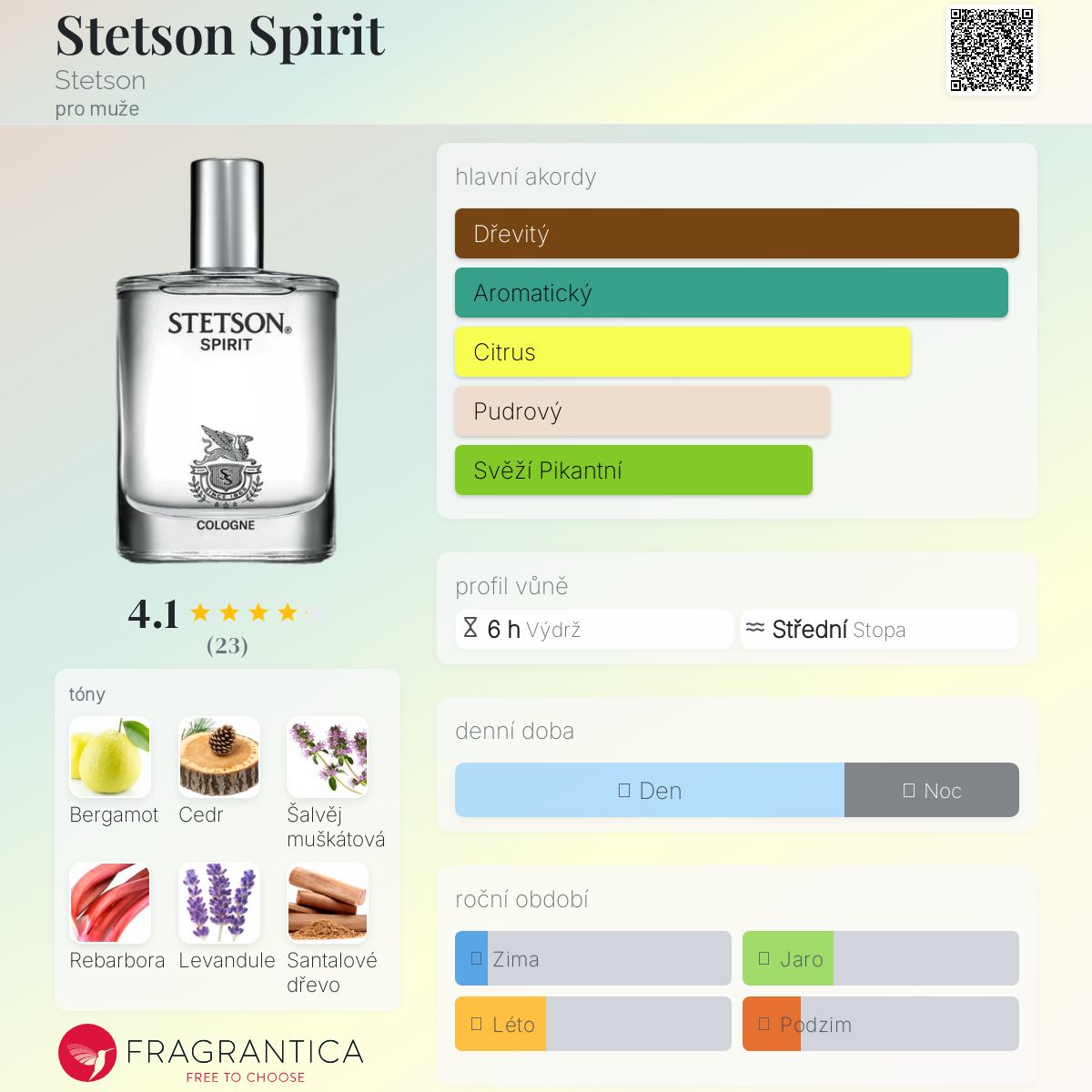 Stetson Spirit podle Stetson je Woody Aromatic vůně pro muže. Stetson Spirit byl/a uveden/a v roce 2021. Vrchní tóny jsou Bergamot, Rebarbora, Mandarinkový list a Elimi; střední tóny jsouŠalvěj muškátová, Divoká levandule, Labdanum a Kůže ; základní tóny jsou Virginský cedr, Santalové dřevo, Pižmo a Jantar (ambra).