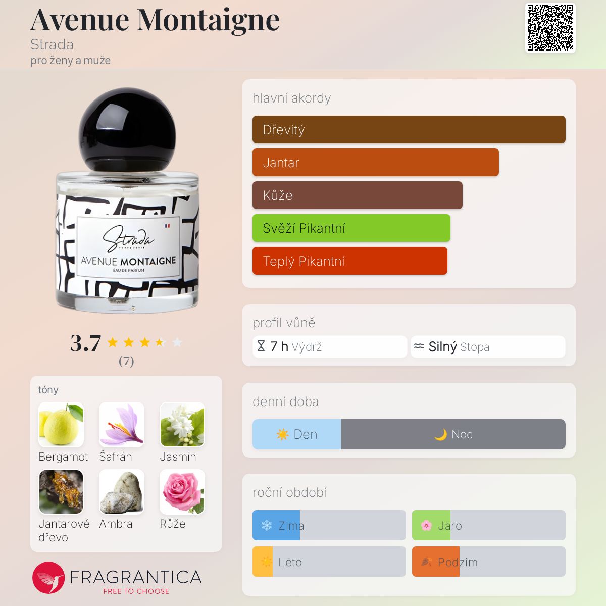 Avenue Montaigne podle Strada je Woody Floral Musk vůně pro ženy a muže. Avenue Montaigne byl/a uveden/a v roce 2020. "Nosem" za touto vůní je Cyrille Carles. Vrchní tóny jsou Bergamot, Šafrán a Jasmín; střední tóny jsouJantarové dřevo, Ambra, Marocký jasmín, Růže a Bříza ; základní tóny jsou Jedlová pryskyřice, Cedr, Pižmo a Vanilka.