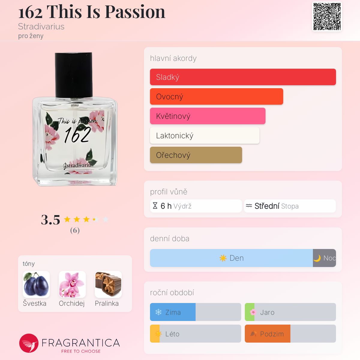 162 This Is Passion podle Stradivarius je Floral Fruity Gourmand vůně pro ženy. 162 This Is Passion byl/a uveden/a v roce 2019. Vrchní tón je Švestka ; střední tón jeOrchidej ; základní tón je Pralinka.
