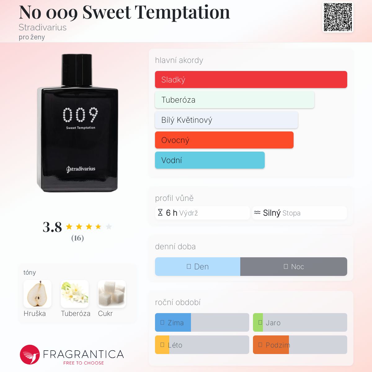 No 009 Sweet Temptation podle Stradivarius je Floral Fruity Gourmand vůně pro ženy. No 009 Sweet Temptation byl/a uveden/a v roce 2019. Vrchní tón je Hruška ; střední tón jeTuberóza ; základní tón je Cukr.