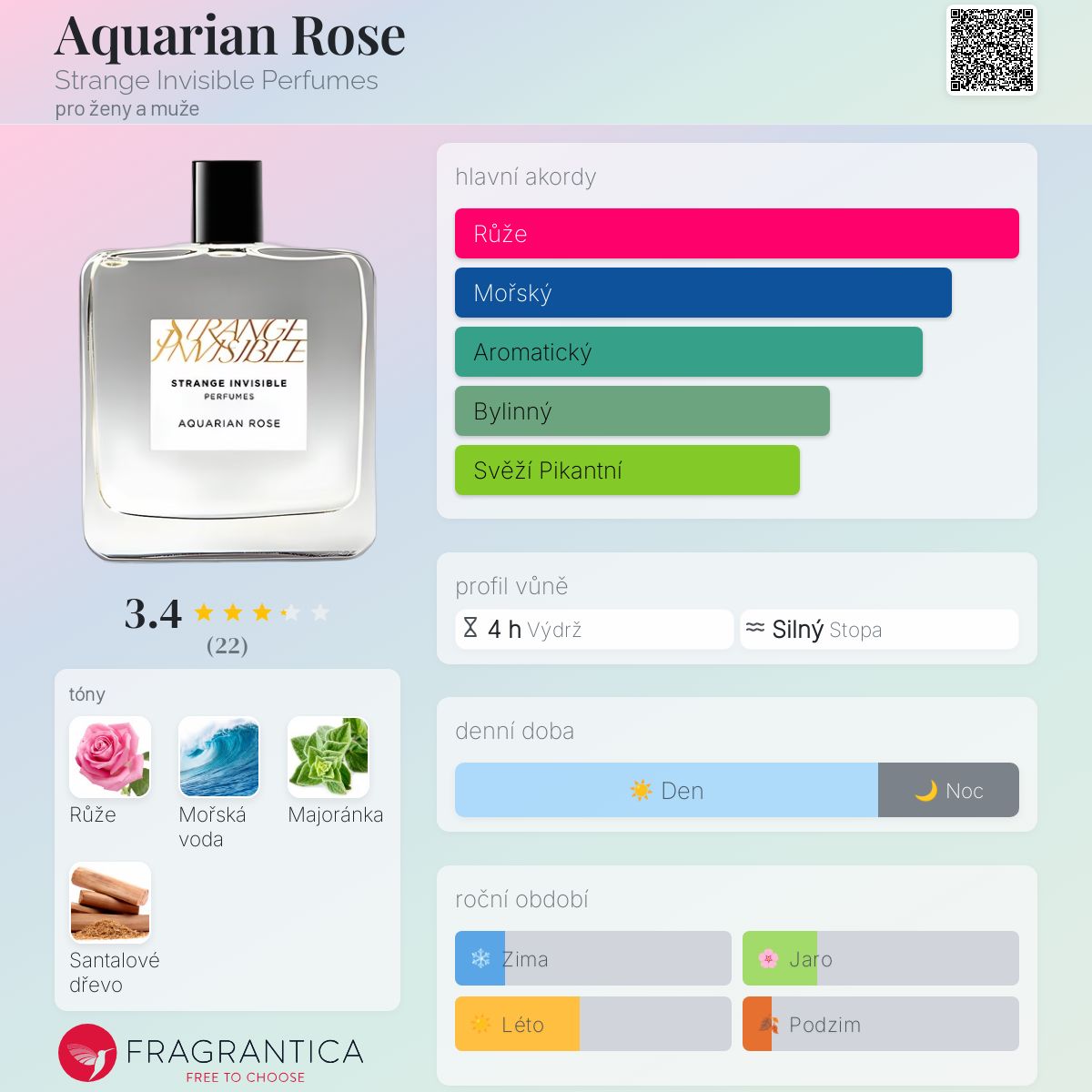 Aquarian Rose podle Strange Invisible Perfumes je Floral vůně pro ženy a muže. Aquarian Rose byl/a uveden/a v roce 2009. Vrchní tóny jsou Mořská voda a Majoránka; střední tón jeRůže ; základní tón je Santalové dřevo.