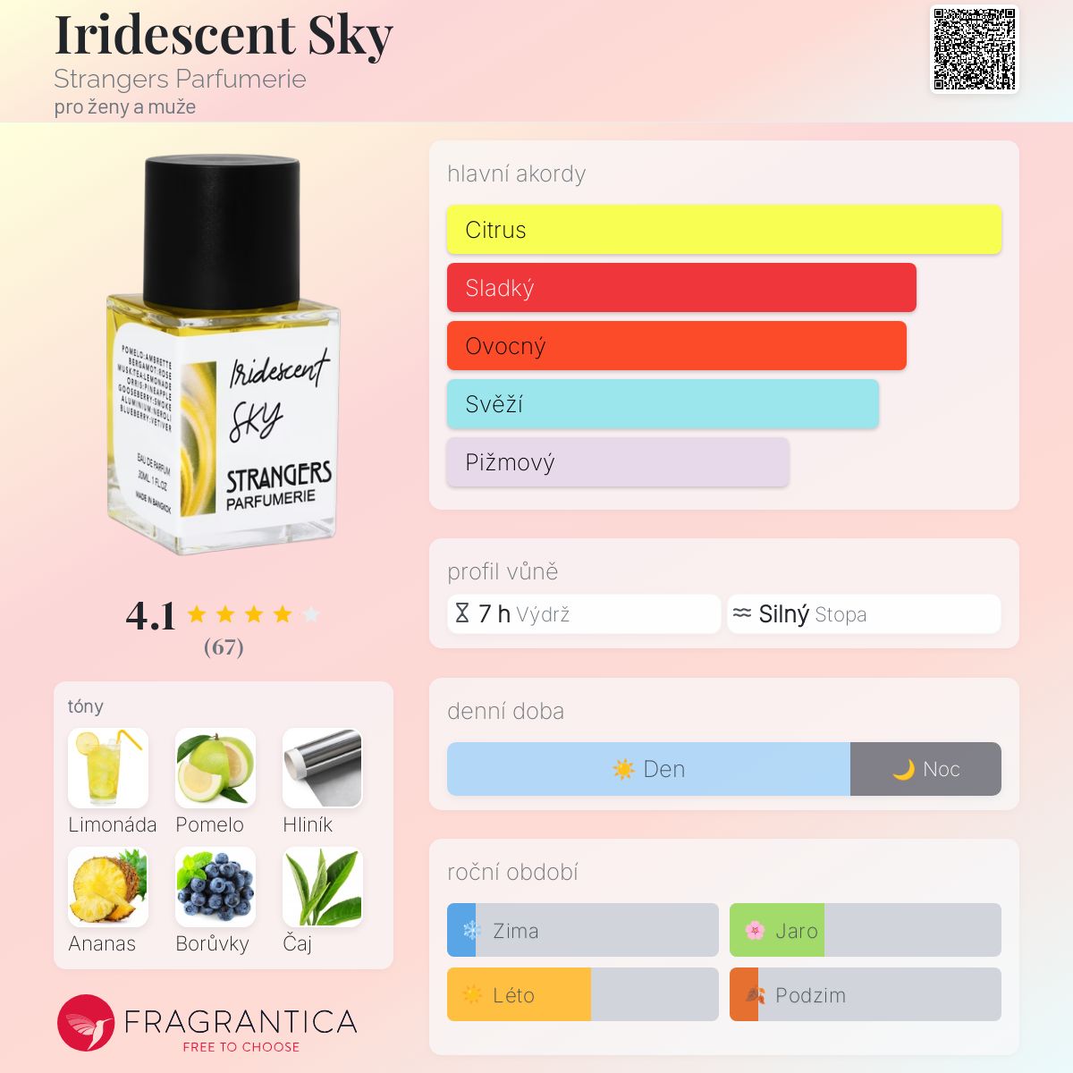 Iridescent Sky podle Strangers Parfumerie je Citrus vůně pro ženy a muže. Iridescent Sky byl/a uveden/a v roce 2020. "Nosem" za touto vůní je Prin Lomros.