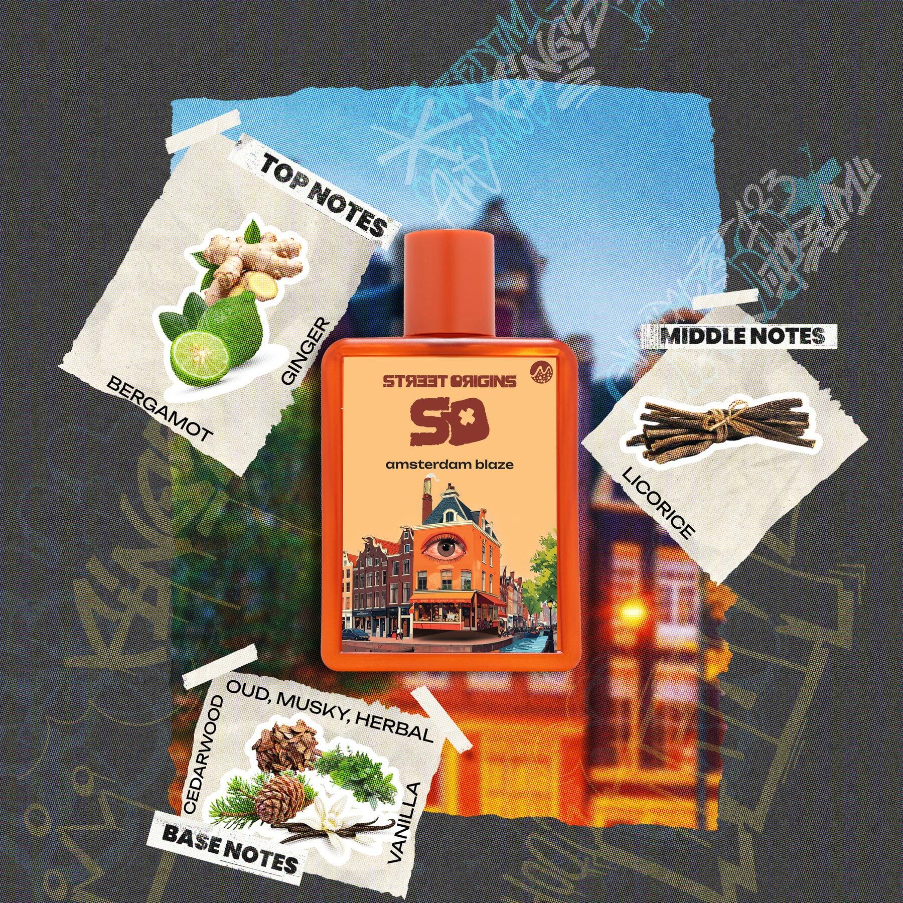 Amsterdam Blaze podle Street Origins je Orientální Woody vůně pro ženy a muže. Toto je nová vůně. Amsterdam Blaze byl/a uveden/a v roce 2025. Vrchní tóny jsou Bergamot a Zázvor; střední tón jeLékořice ; základní tóny jsou Cedr, Bylinné tóny, Pižmo, Agarové dřevo (oud) a Vanilka.