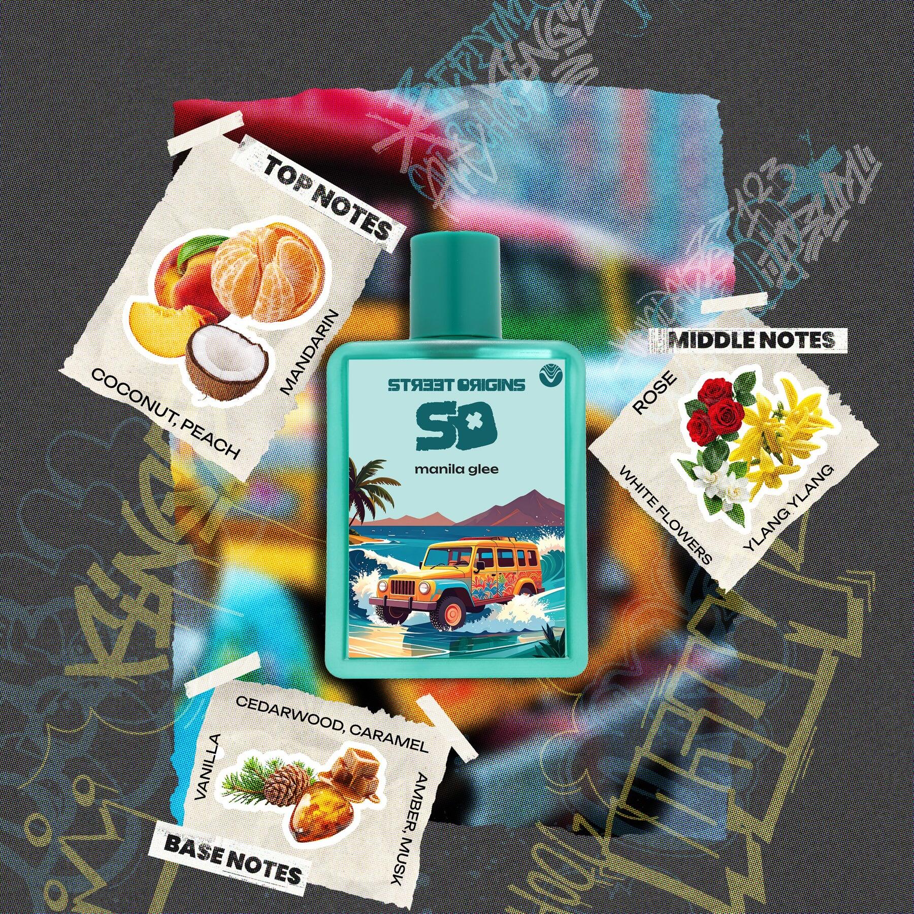 Manila Glee podle Street Origins je Floral Fruity Gourmand vůně pro ženy a muže. Toto je nová vůně. Manila Glee byl/a uveden/a v roce 2025. Vrchní tóny jsou Mandarinka, Kokos a Broskev; střední tóny jsouBílé květy, Sladké tóny, Ylang-Ylang a Růže ; základní tóny jsou Cedr, Vanilka, Karamel, Jantar (ambra) a Pižmo.