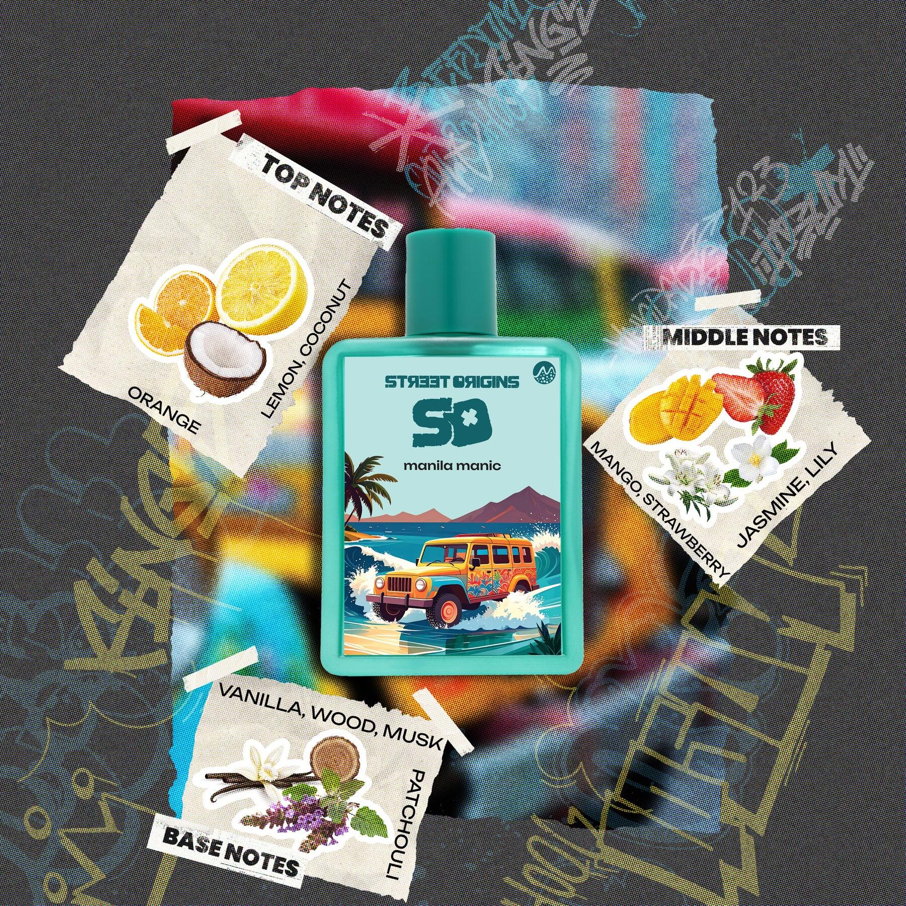 Manila Manic podle Street Origins je Floral Fruity Gourmand vůně pro ženy a muže. Toto je nová vůně. Manila Manic byl/a uveden/a v roce 2025. Vrchní tóny jsou Zelené tóny, Kokos, Pomeranč a Citrón; střední tóny jsouJahoda, Jasmín, Mango a Lilie ; základní tóny jsou Dřevité tóny, Pačuli, Vanilka a Pižmo.
