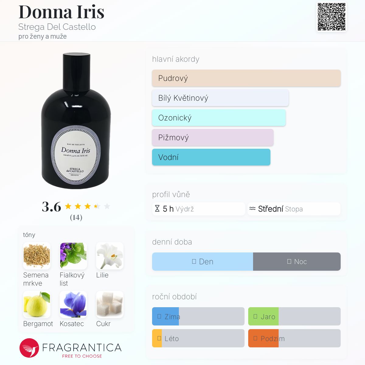 Donna Iris podle Strega Del Castello je vůně pro ženy a muže. Vrchní tóny jsou Semena mrkve, Fialkový list a Bergamot; střední tón jeLilie ; základní tóny jsou Kosatec a Cukr.