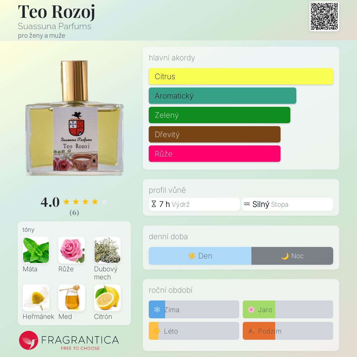 Teo Rozoj podle Suassuna Parfums je Floral Green vůně pro ženy a muže. Teo Rozoj byl/a uveden/a v roce 2020. "Nosem" za touto vůní je Nilton Suassuna. Vrchní tóny jsou Máta, Citrón, Bergamot, Mandarinka a Pomeranč; střední tóny jsouČajová růže, Heřmánek a Med ; základní tóny jsou Dubový mech, Cabreuva, Pačuli, Vanilka, Pižmo a Cedr.