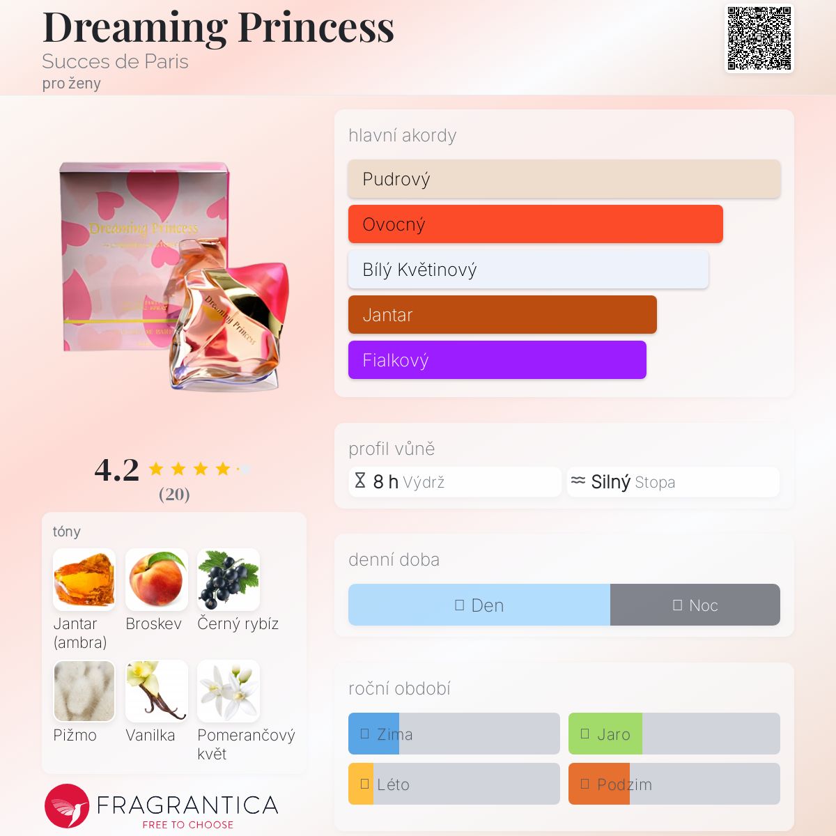 Dreaming Princess podle Succes de Paris je Floral vůně pro ženy. Vrchní tóny jsou Černý rybíz, Květ afrického pomeranče, Fialka, Galbanum a Bergamot; střední tóny jsouBroskev, Kosatec, Růže, Jasmín a Konvalinka ; základní tóny jsou Jantar (ambra), Pižmo, Vanilka a Virginský cedr.