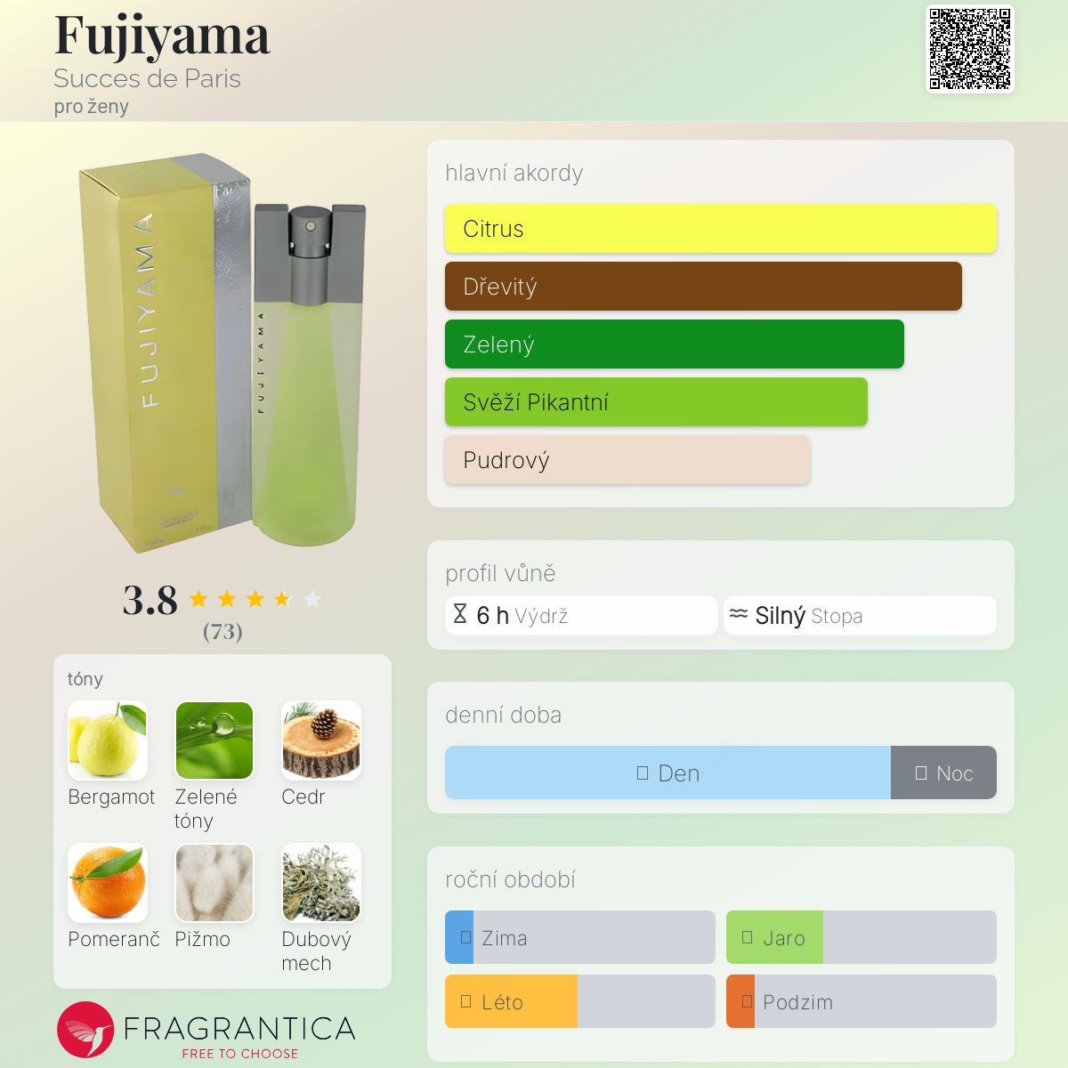 Fujiyama podle Succes de Paris je Floral Woody Musk vůně pro ženy. Fujiyama byl/a uveden/a v roce 1995. Vrchní tóny jsou Bergamot, Zelené tóny, Pomeranč a Brazilské růžové dřevo; střední tóny jsouMuškátový oříšek, Jasmín a Růže ; základní tóny jsou Cedr, Pižmo, Dubový mech, Santalové dřevo a Jantar (ambra).
