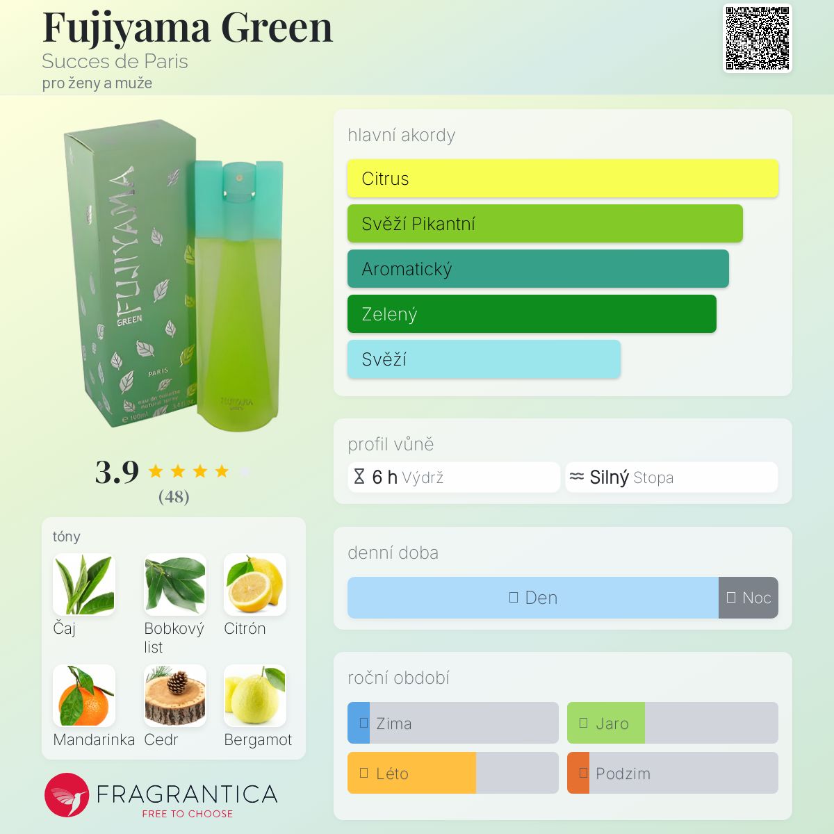 Fujiyama Green podle Succes de Paris je Citrus Aromatic vůně pro ženy a muže. Fujiyama Green byl/a uveden/a v roce 2001. Vrchní tóny jsou Zelený čaj, Citrón, Mandarinka a Bergamot; střední tóny jsouMáta, Tymián, Brambořík a Konvalinka ; základní tóny jsou Vavříny, Cedr a Bílé pižmo.