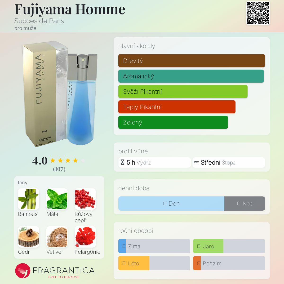 Fujiyama Homme podle Succes de Paris je Woody Aquatic vůně pro muže. Fujiyama Homme byl/a uveden/a v roce 1995. Vrchní tóny jsou Bambus, Máta a Hřebíček; střední tóny jsouRůžový pepř, Cedr, Pelargónie a Muškátový oříšek ; základní tóny jsou Vetiver, Kardamom a Benzoin.