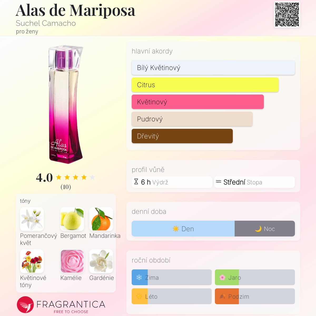 Alas de Mariposa podle Suchel Camacho je Floral Fruity vůně pro ženy. Alas de Mariposa byl/a uveden/a v roce 2014. Vrchní tóny jsou Pomerančový květ, Bergamot a Mandarinka; střední tóny jsouKvětinové tóny, Kamélie, Gardénie a Lilie ; základní tóny jsou Santalové dřevo a Pižmo.