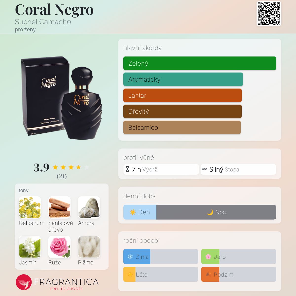 Coral Negro podle Suchel Camacho je Floral Woody Musk vůně pro ženy. Vrchní tóny jsou Galbanum a Citrón; střední tóny jsouSantalové dřevo, Jasmín a Růže ; základní tóny jsou Ambra a Pižmo.