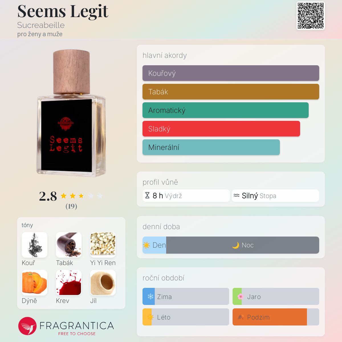 Seems Legit podle Sucreabeille je Orientální vůně pro ženy a muže. Seems Legit byl/a uveden/a v roce 2019. "Nosem" za touto vůní je Andrea Fender.