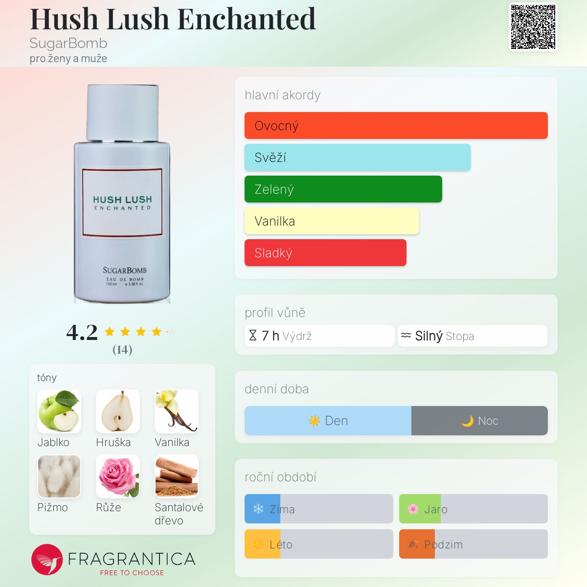 Hush Lush Enchanted podle SugarBomb je vůně pro ženy a muže. Hush Lush Enchanted byl/a uveden/a v roce 2023. "Nosem" za touto vůní je Kajal Gujar. Vrchní tóny jsou Jablko a Hruška; střední tón jeBílá růže ; základní tóny jsou Vanilka, Pižmo a Santalové dřevo.