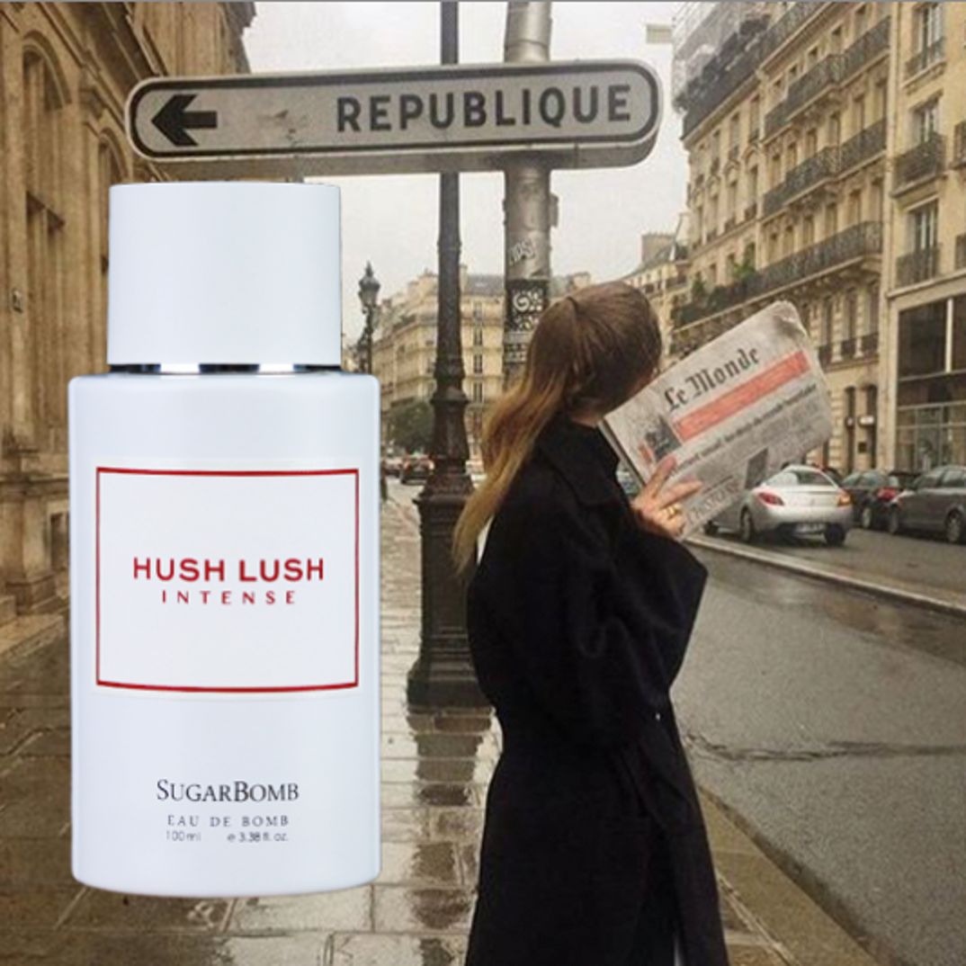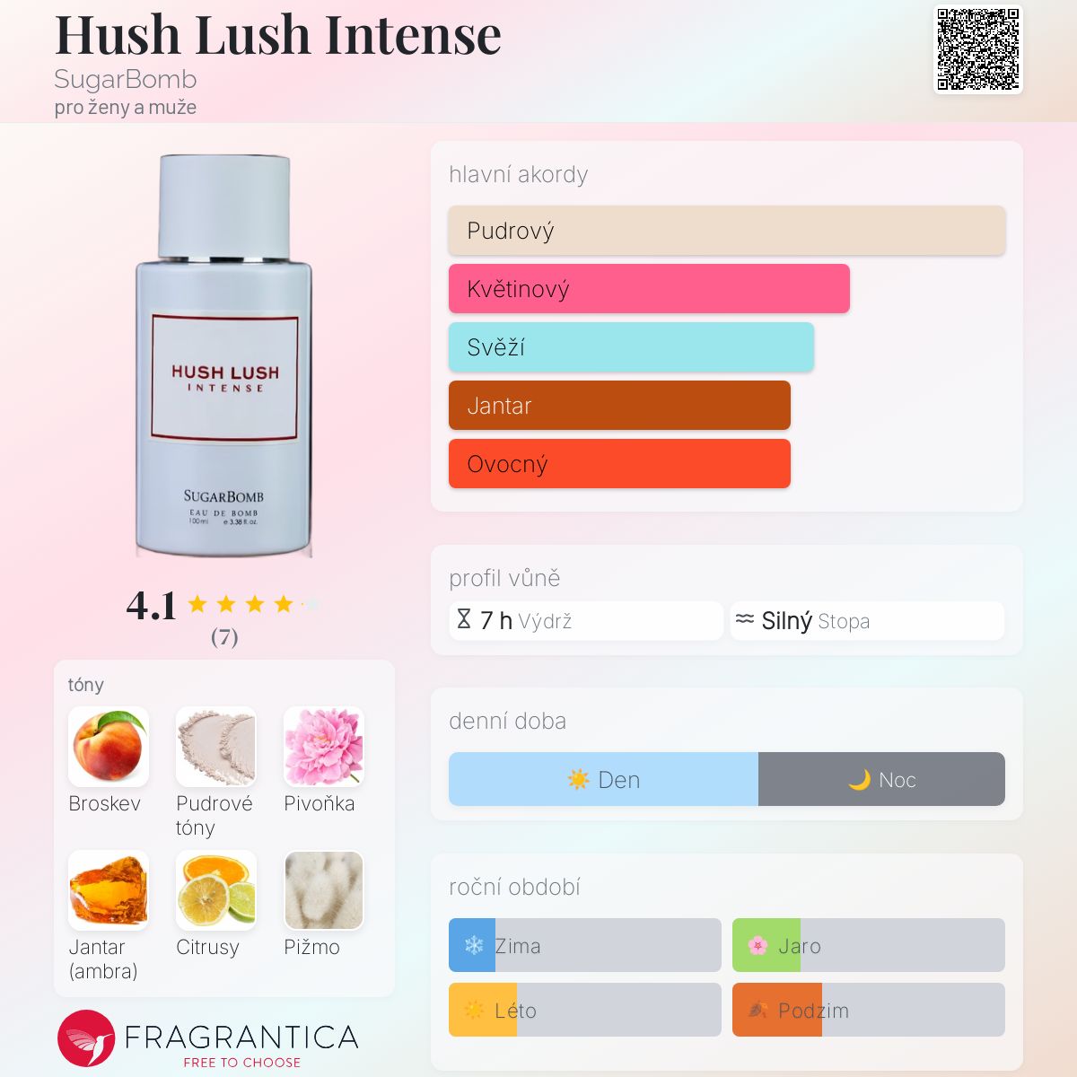 Hush Lush Intense podle SugarBomb je vůně pro ženy a muže. Hush Lush Intense byl/a uveden/a v roce 2023. "Nosem" za touto vůní je Kajal Gujar. Vrchní tóny jsou Broskev, Citrusy a Jablko; střední tón jePivoňka ; základní tóny jsou Pudrové tóny, Jantar (ambra) a Pižmo.