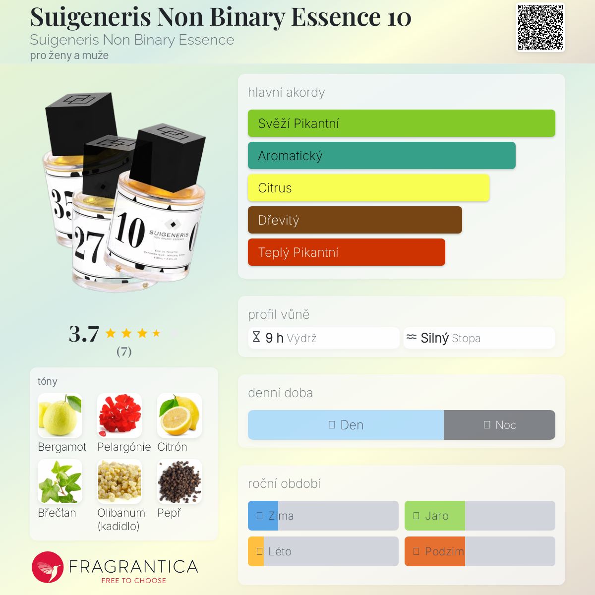 Suigeneris Non Binary Essence 10 podle Suigeneris Non Binary Essence je Woody Aromatic vůně pro ženy a muže. Suigeneris Non Binary Essence 10 byl/a uveden/a v roce 2018. "Nosem" za touto vůní je Xavier Dufourcq - Chappaz. Vrchní tóny jsou Bergamot, Citrón, Břečťan a Pepř; střední tóny jsouPelargónie, Olibanum, Jedle balzámová a Kašmírové dřevo ; základní tóny jsou Vetiver, Semiš, Šafrán, Pižmo a Pačuli.