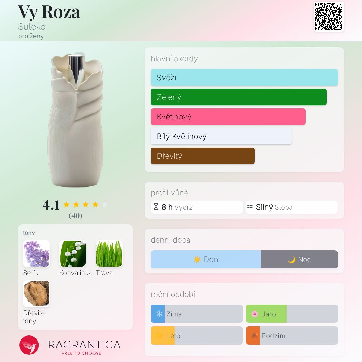 Vy Roza podle Suleko je Floral Green vůně pro ženy. Vy Roza byl/a uveden/a v roce 2013. "Nosem" za touto vůní je Cécile Zarokian.